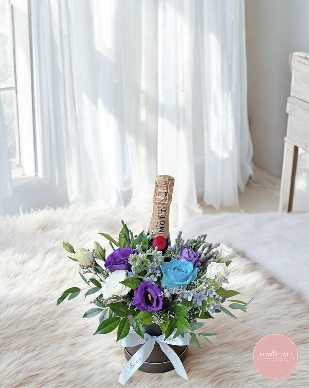 Celebrate in style with this luxurious arrangement featuring a bottle of Moët champagne surrounded by a stunning display of blue and purple roses, delicate lisianthus, and fresh greenery. Set in an elegant black hatbox and tied with a satin ribbon, this sophisticated gift is perfect for special occasions, making any moment even more memorable.