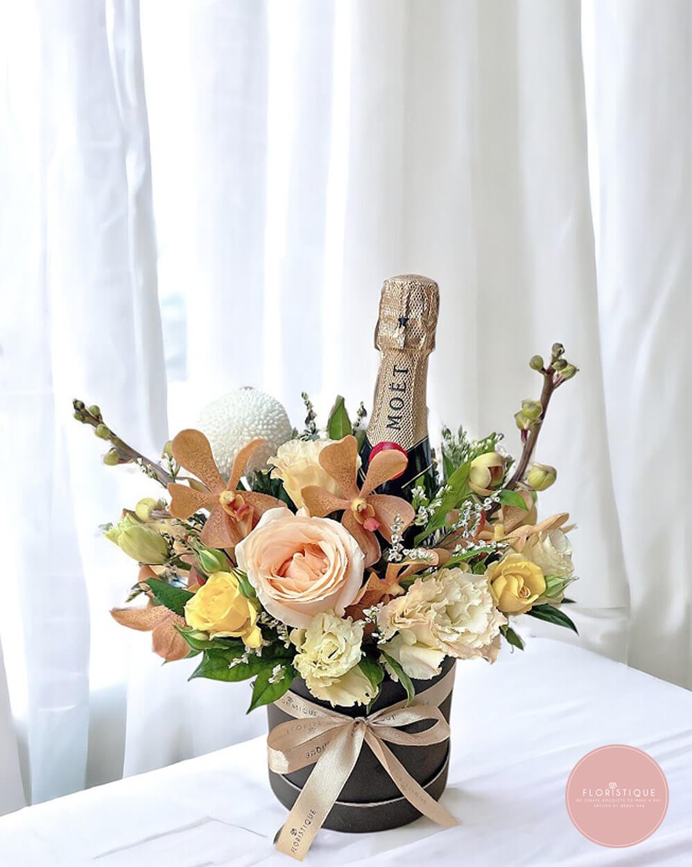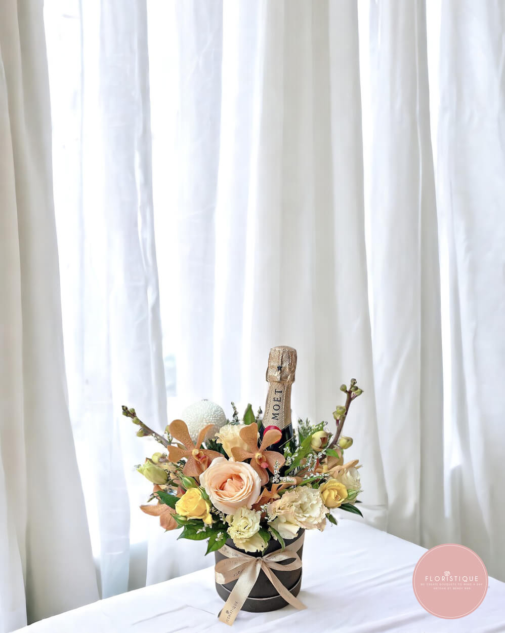 Celebrate life's moments with this exquisite floral arrangement featuring elegant peach roses, vibrant yellow blooms, and exotic orchids. Accented with lush greenery, it radiates joy and sophistication. Paired with a bottle of Moët, this luxurious gift set is perfect for congratulatory occasions, anniversaries, or heartfelt gestures, leaving lasting impressions.