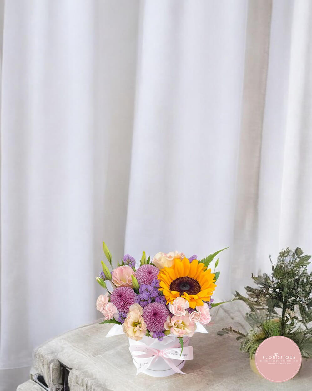Cheerful and charming, this floral box features a radiant sunflower paired with purple chrysanthemums, soft pink blooms, and fresh fillers. Arranged in a chic round pot with a ribbon finish, it makes a perfect centerpiece or thoughtful gift for birthdays, anniversaries, or any special moment.