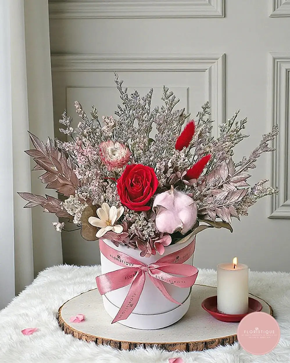 A romantic keepsake featuring a vivid preserved red rose framed by dusty-mauve foliage, fluffy cotton, bunny tails and dainty meadow fillers—arranged in a chic round box with a satin bow. Soft blush tones meet a pop of crimson for a classy, photo-ready finish that stays beautiful for months with minimal care (no watering; keep cool and dry).