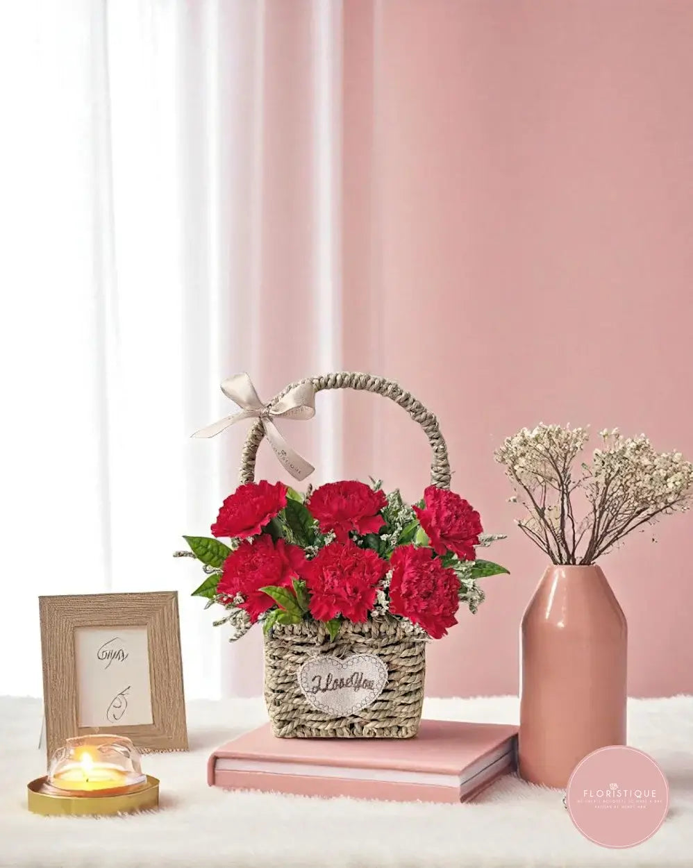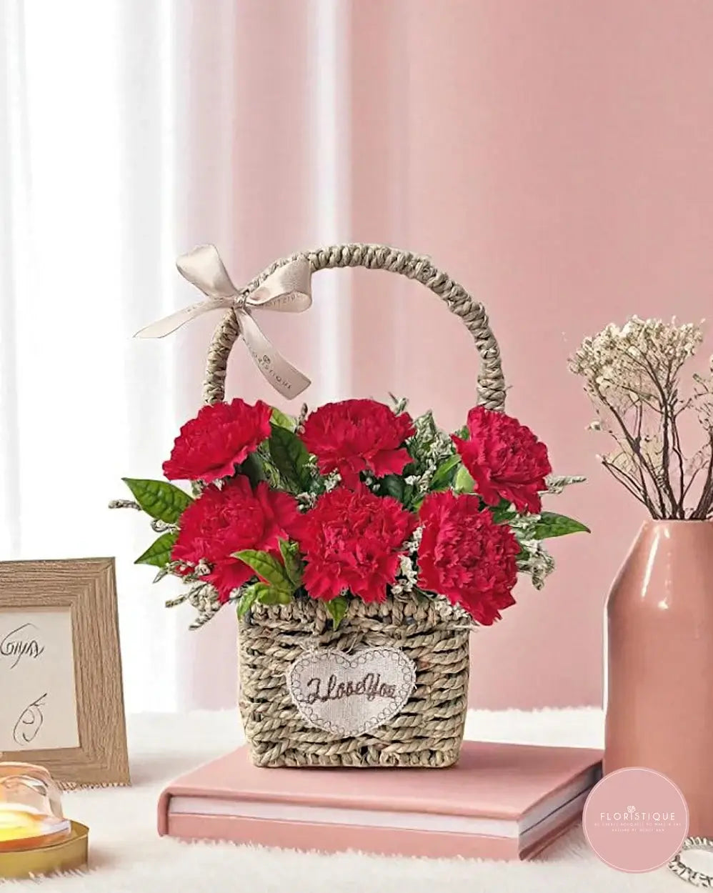 This charming woven basket showcases a radiant cluster of red carnations, accented with fresh greenery and delicate filler flowers. The rustic heart-stitched patch reading “I Love You” adds a heartfelt touch, making this arrangement a sweet and meaningful gift.