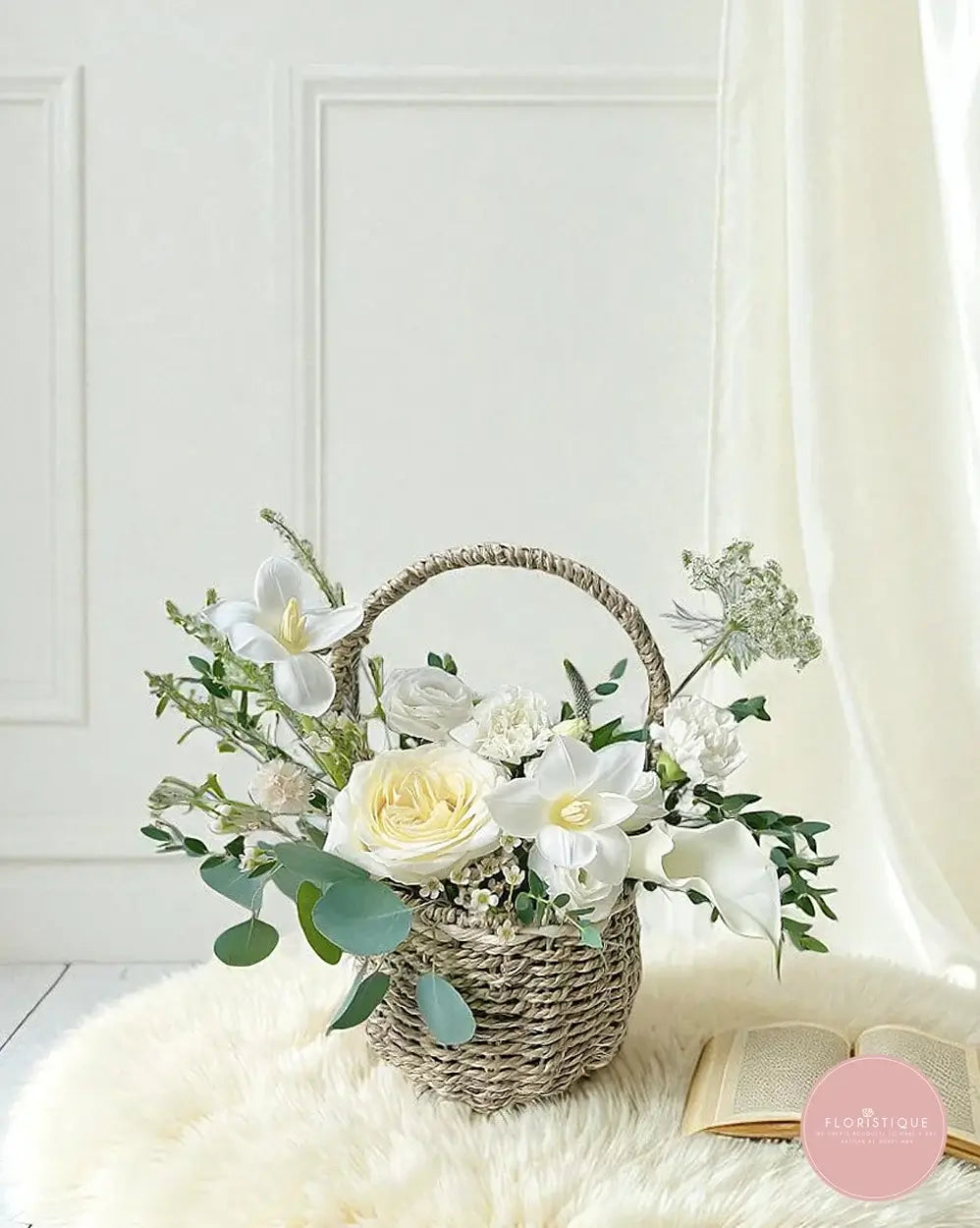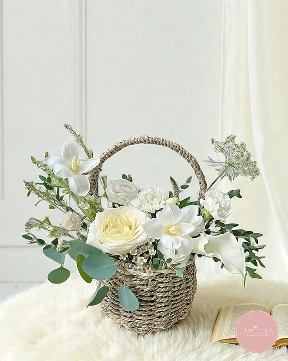 This elegant white flower basket features a graceful blend of cream roses, white lilies, eustoma, carnations, and soft greenery, artfully arranged in a natural woven basket. A perfect representation of peace and purity, this arrangement brings calmness and grace to any setting.