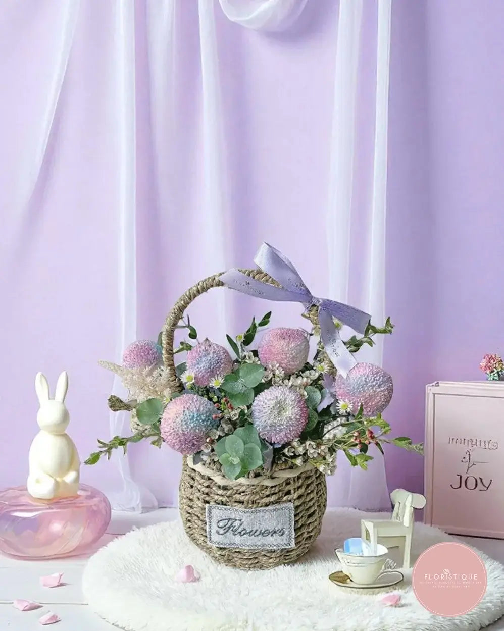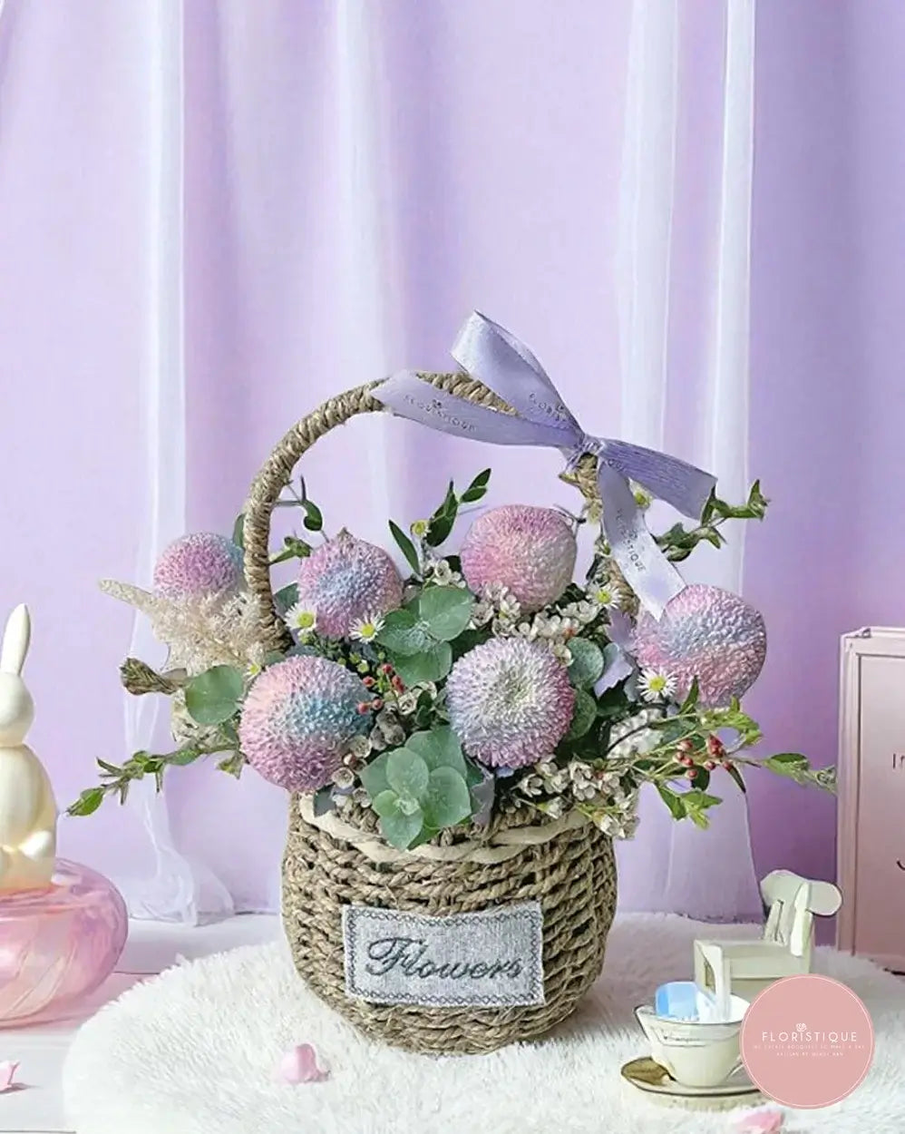 This enchanting pastel basket arrangement features a delightful mix of rainbow-tinted ping pong chrysanthemums, dainty daisies, eucalyptus leaves, and delicate filler blooms. Tied with a soft lavender ribbon, it’s a sweet and dreamy floral display that radiates charm and joy.