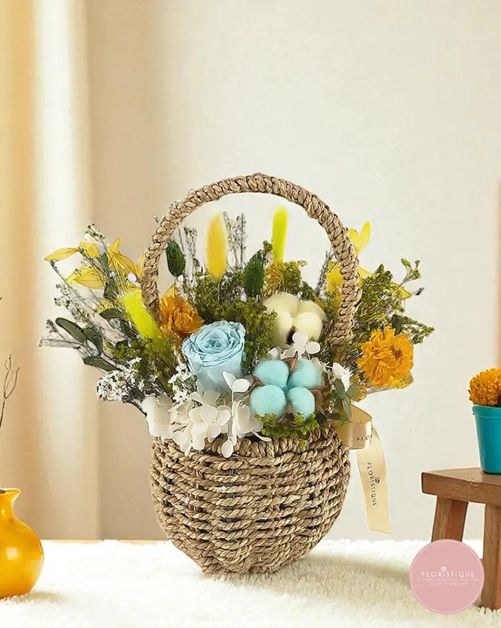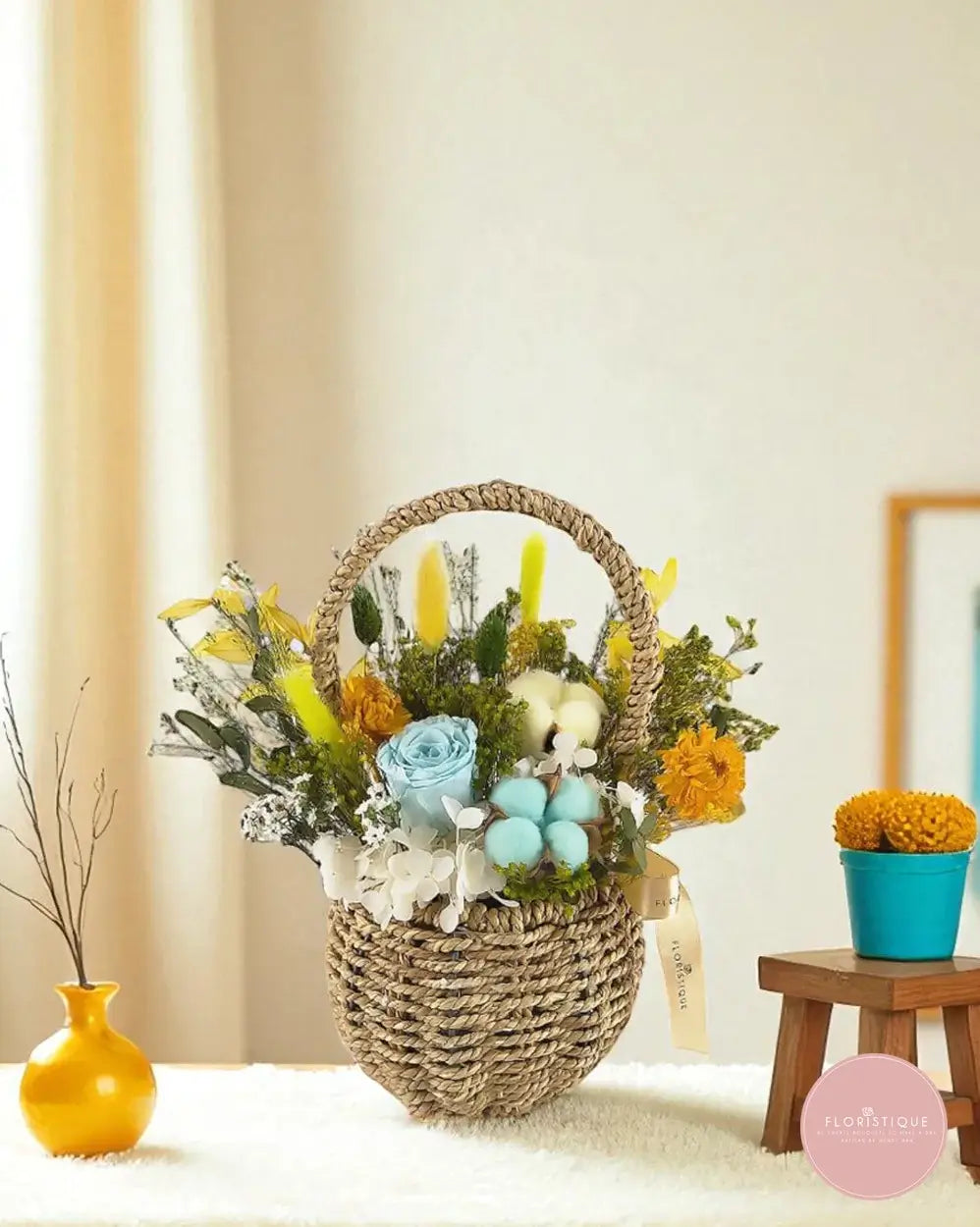 This cheerful preserved flower basket features a harmonious blend of vibrant yellow, turquoise, and soft ivory tones. With a unique blue rose as its centrepiece, it’s complemented by billy buttons, preserved hydrangeas, bunny tails, and dried foliage, evoking the warmth of a sunlit field.