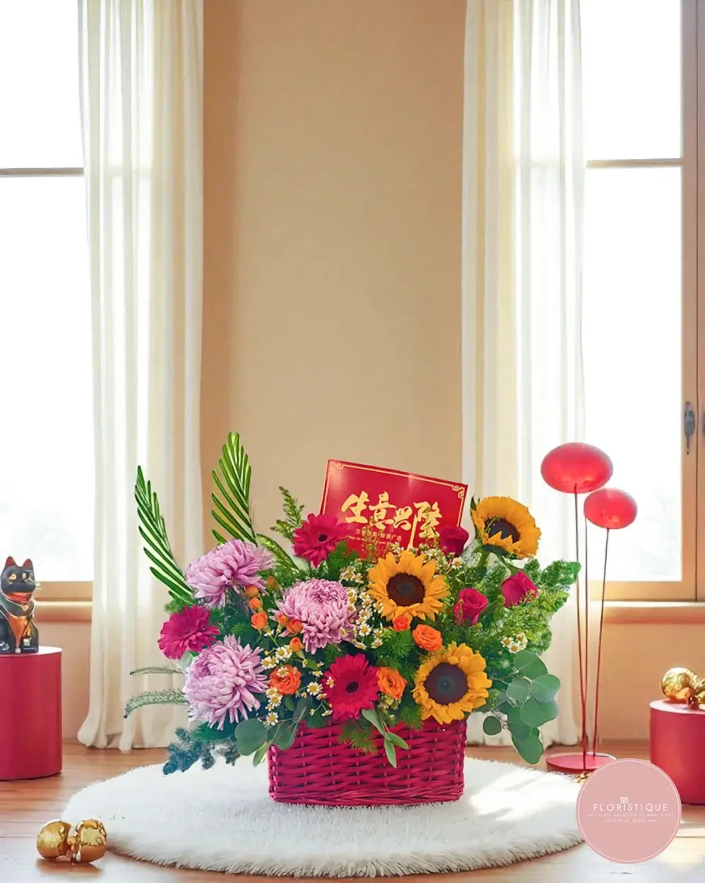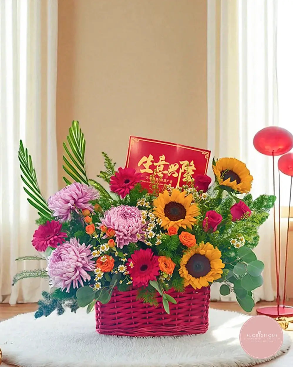 Celebrate new beginnings with this striking grand opening flower basket, brimming with radiant sunflowers, bold gerberas, charming chrysanthemums, and elegant roses. Nestled in a vivid red woven base, this lush arrangement bursts with colour and vitality — symbolising success, prosperity, and joy. Perfect for congratulating business launches, store openings, or special milestones.