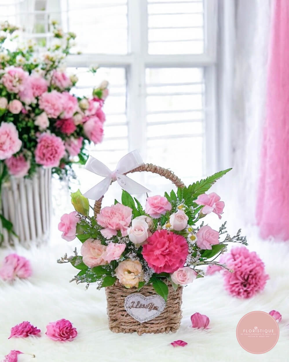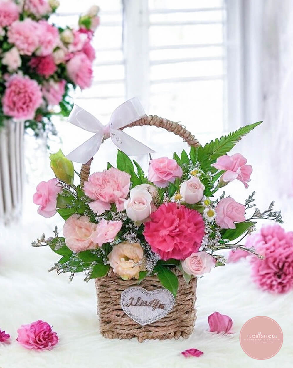 This delightful floral basket arrangement features a soft medley of pink carnations, roses, lisianthus, and dainty fillers, thoughtfully arranged in a woven basket adorned with a heart-shaped "I Love You" patch. Accented with lush greens and topped with a satin ribbon, it's a heartfelt way to express affection and appreciation.