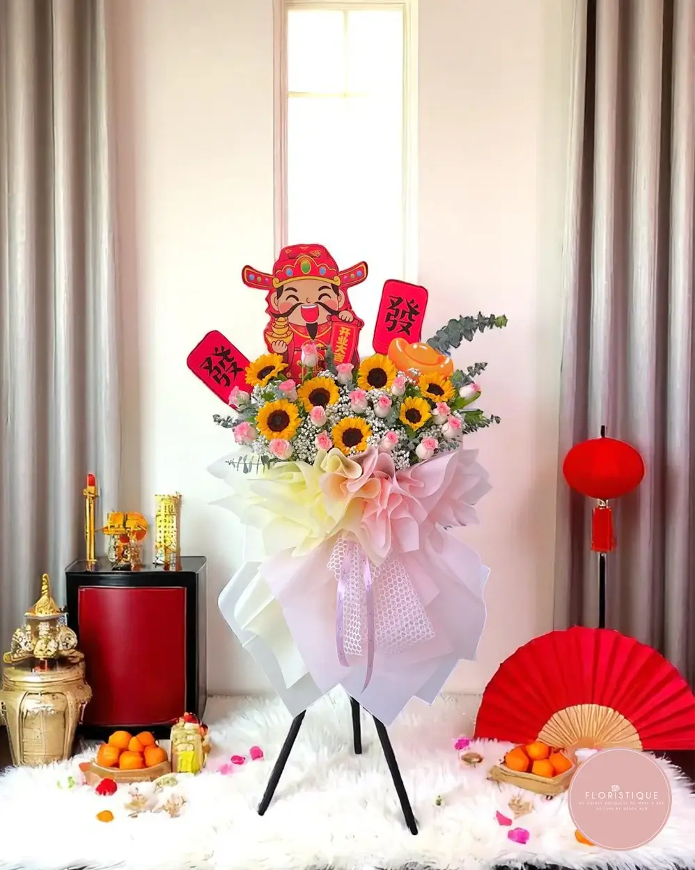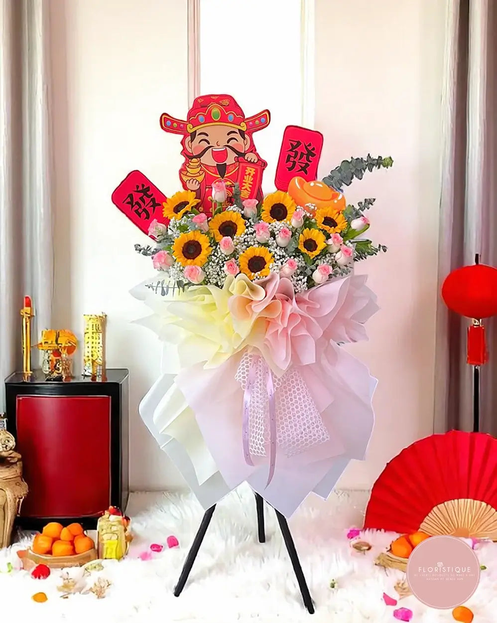 Celebrate new beginnings with this radiant grand opening stand, bursting with cheerful sunflowers, soft pink spray roses, dainty baby’s breath, and lush greenery. Adorned with a charming Caishen (God of Wealth) cut-out and festive red "發" tags, this vibrant arrangement brings joy, luck, and abundance to any business milestone.