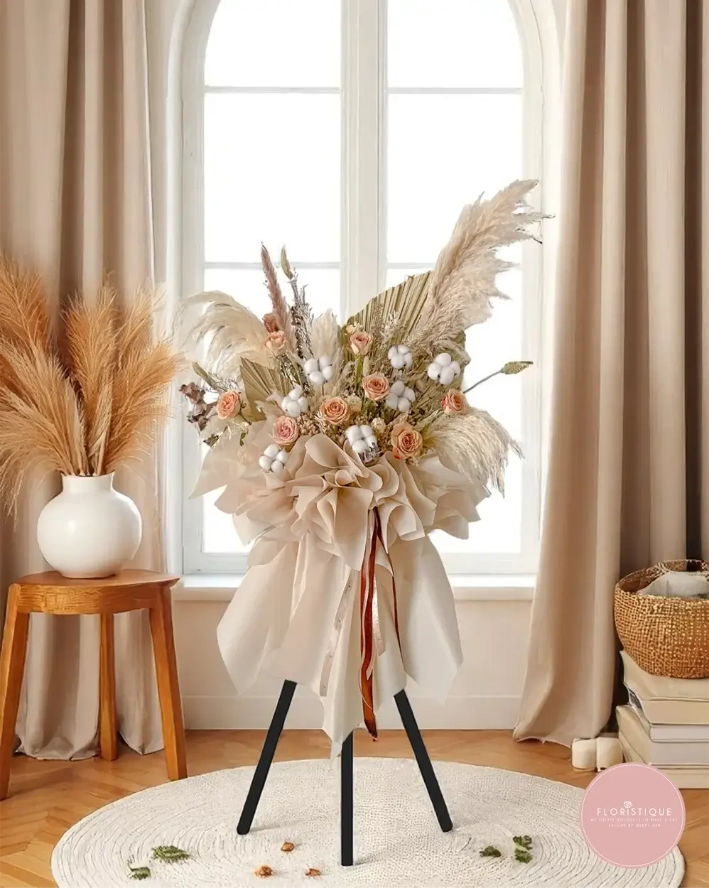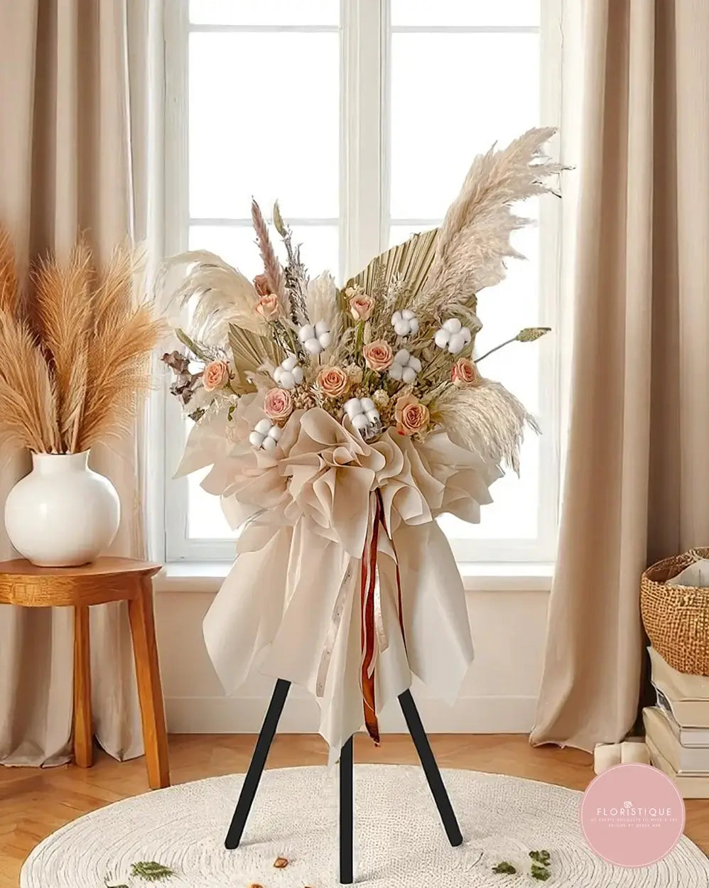 Cappuccino Elegance Tripod Stand for Grand Business Openings—a tasteful floral arrangement designed to mark distinguished new beginnings. Enveloped in cappuccino-toned roses, soft gossypium, and elegant dried blooms, and set against chic nude skirting, this tripod flower stand exudes sophistication and grace. A refined centerpiece that symbolizes stability, elegance, and enduring success—perfect for upscale store openings, corporate launches, or boutique ventures.