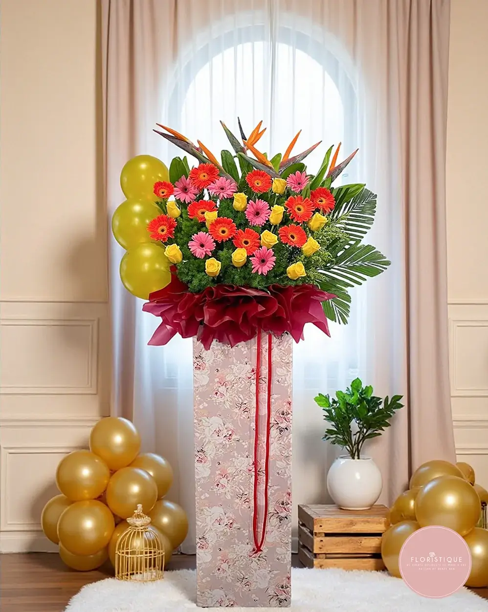 Bold and eye-catching, this grand opening flower stand showcases a fiery combination of orange and red gerberas, birds of paradise, and lush greenery, accented with elegant gold balloons. Set in a floral-print box with rich red wrapping, this arrangement exudes strength, celebration, and prosperity.