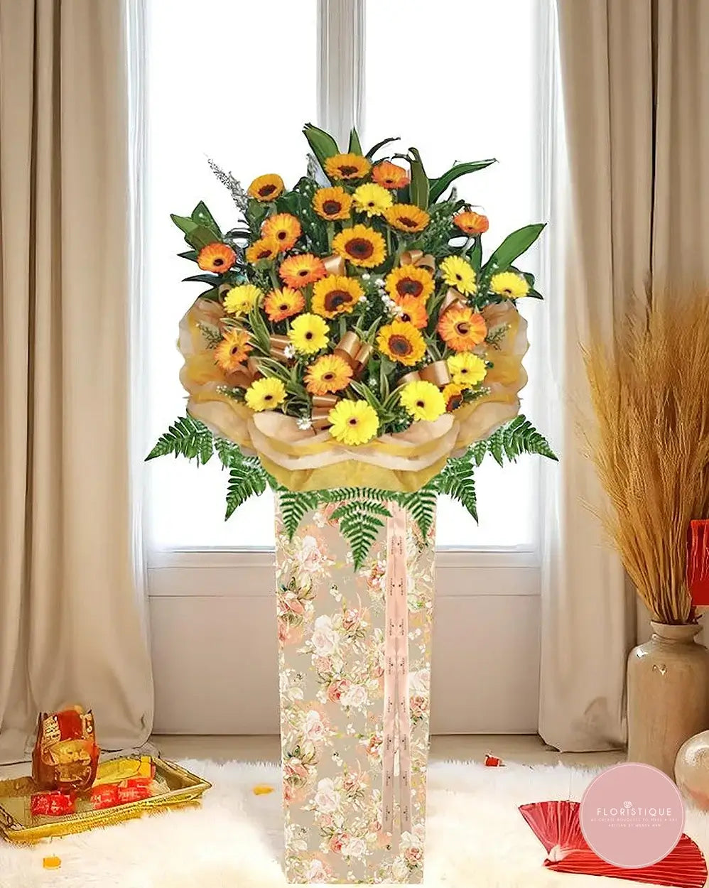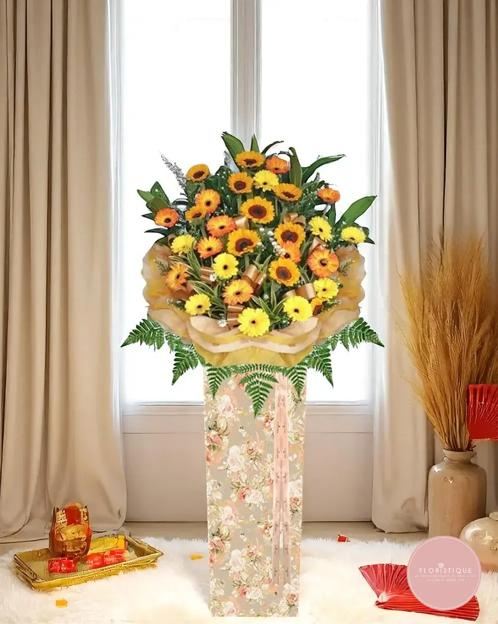 Bright and inviting, this grand opening flower stand features a vibrant mix of yellow and orange gerberas surrounded by lush greens and soft golden wraps. Set in a floral-patterned stand, this cheerful arrangement radiates warmth, positivity, and a wish for flourishing success.
