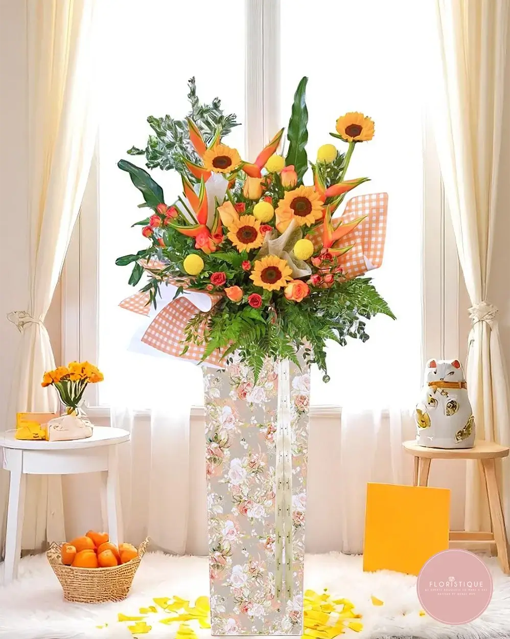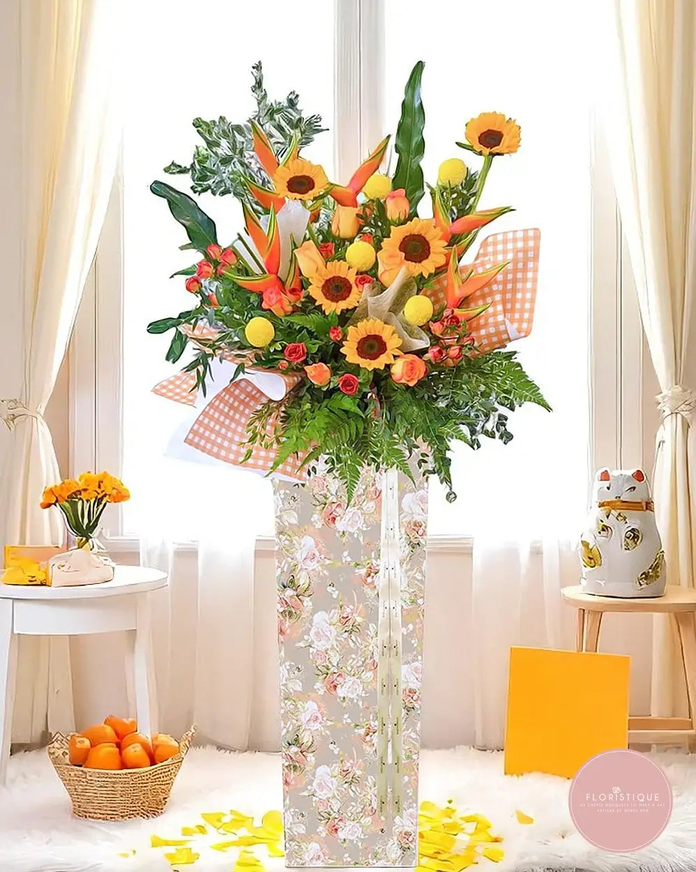 Radiating happiness and good fortune, this grand opening flower stand features bright sunflowers, vibrant tulips, and exotic birds of paradise, all arranged with lush greens and cheerful orange gingham accents. Presented in a charming floral-patterned box, this display is a perfect symbol of optimism and fresh beginnings.