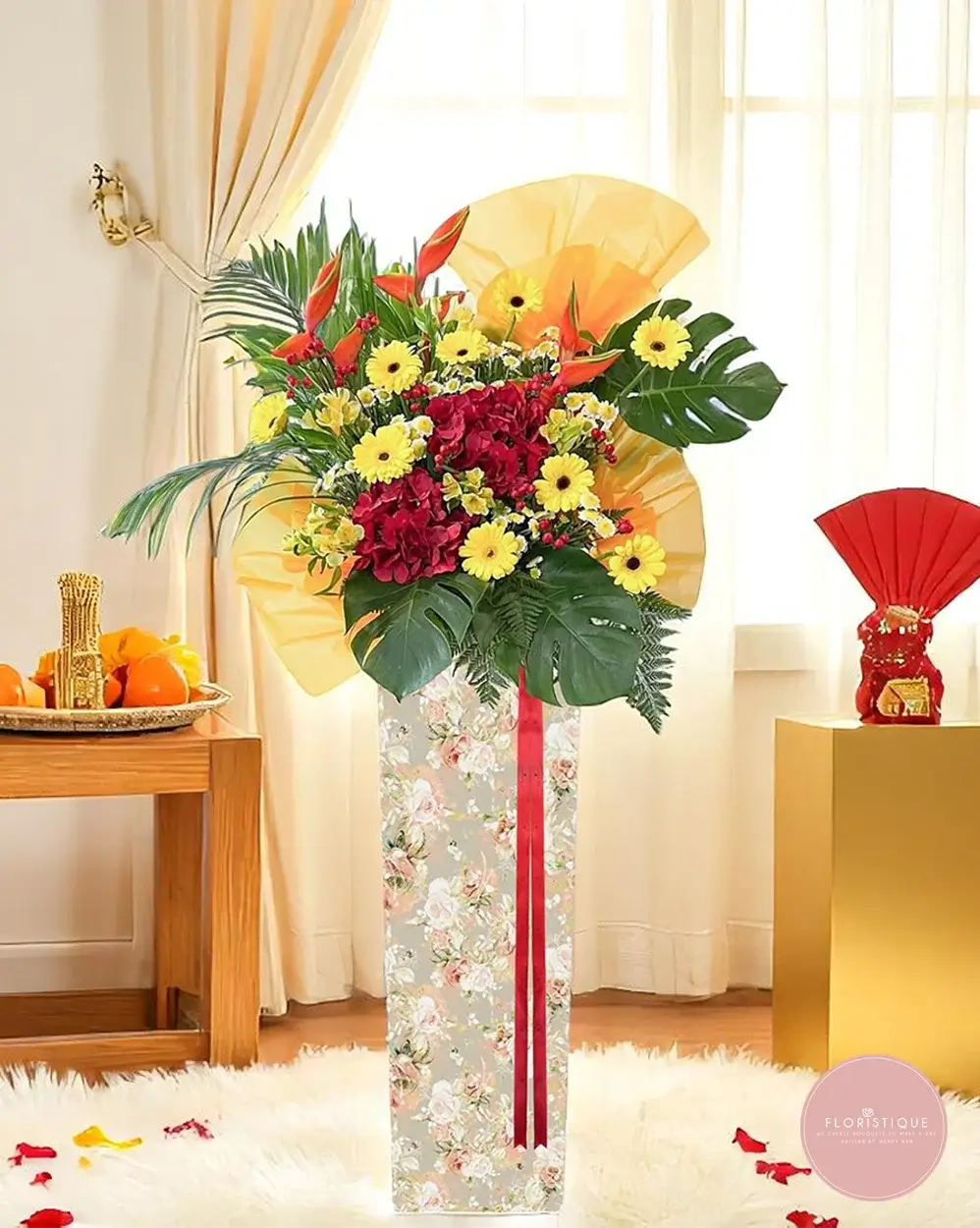 Infused with festive cheer, this grand opening flower stand bursts with bold red carnations, vibrant yellow gerberas, and lush tropical greens—beautifully wrapped in warm golden tones and set in a floral-patterned box. This lively arrangement symbolizes prosperity, vitality, and a bright path ahead.