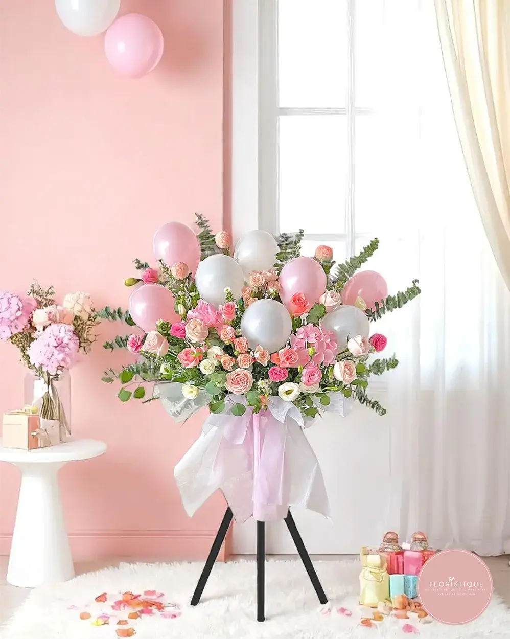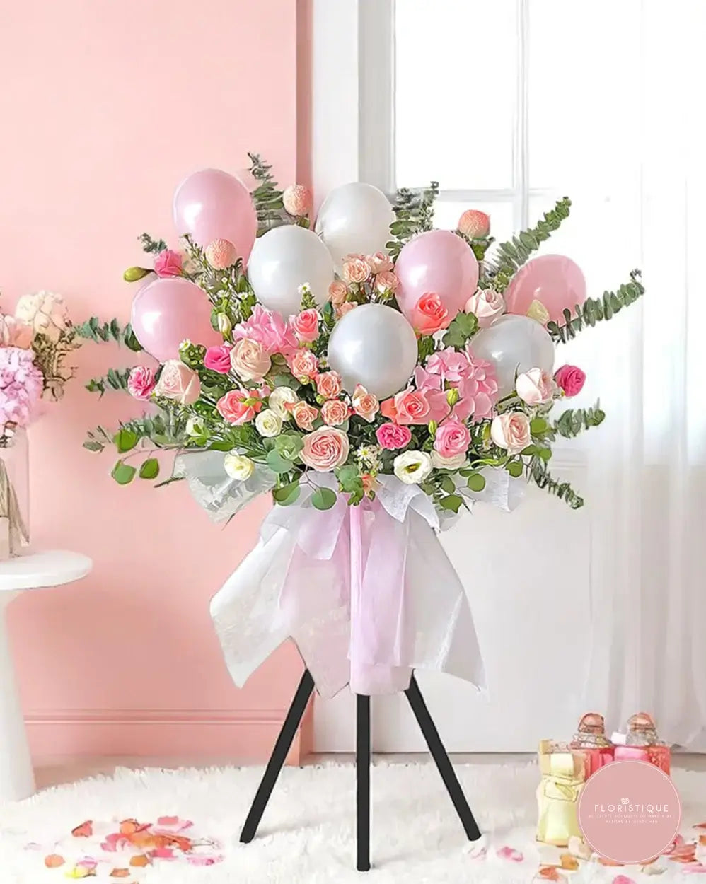 Sweet and whimsical, this grand opening flower stand features a dreamy blend of soft pink and cream roses, white eustomas, and eucalyptus, accented with pastel pink and silver balloons. Wrapped in delicate blush-toned paper and finished with a satin bow, this arrangement is the perfect symbol of joy, grace, and celebration.