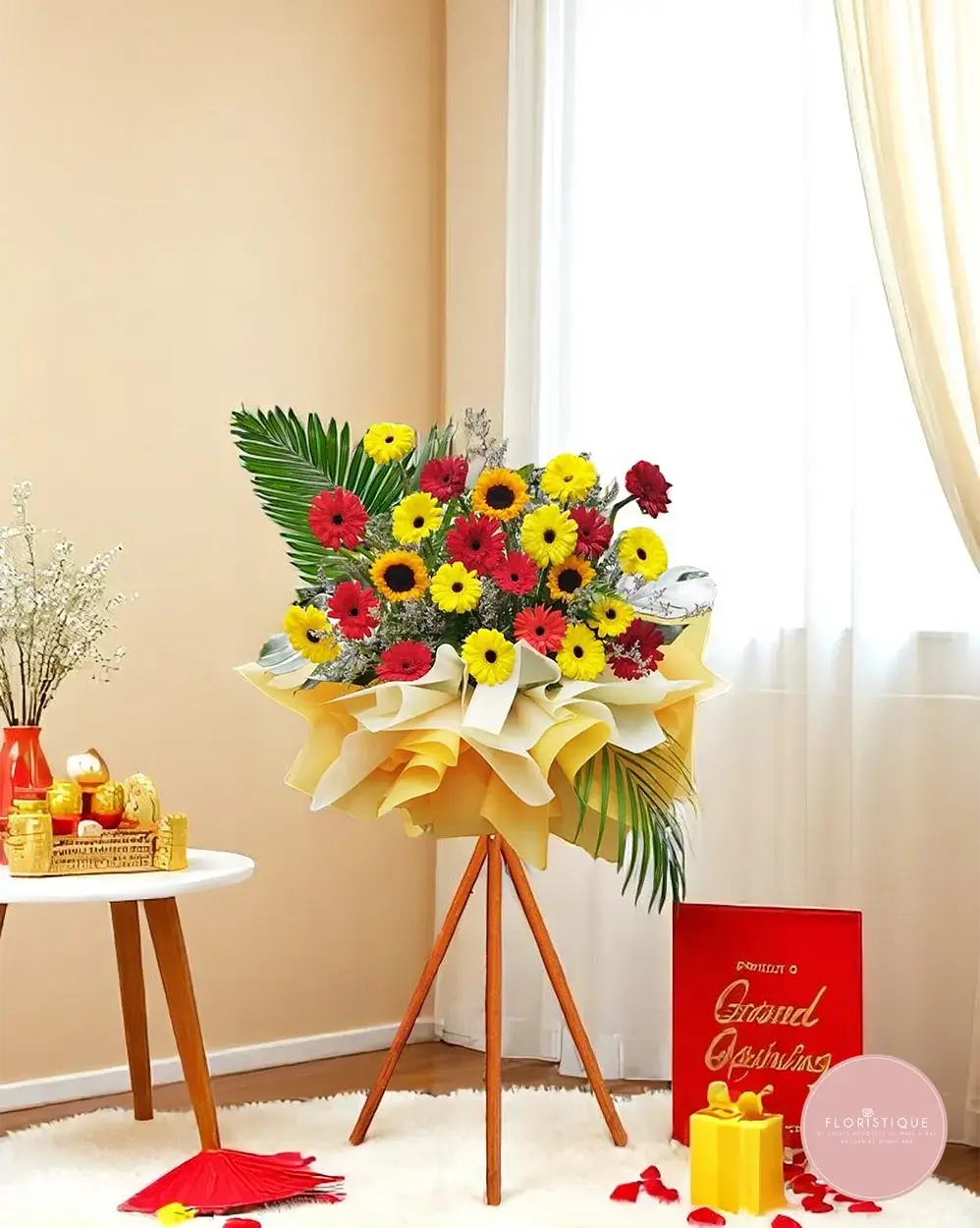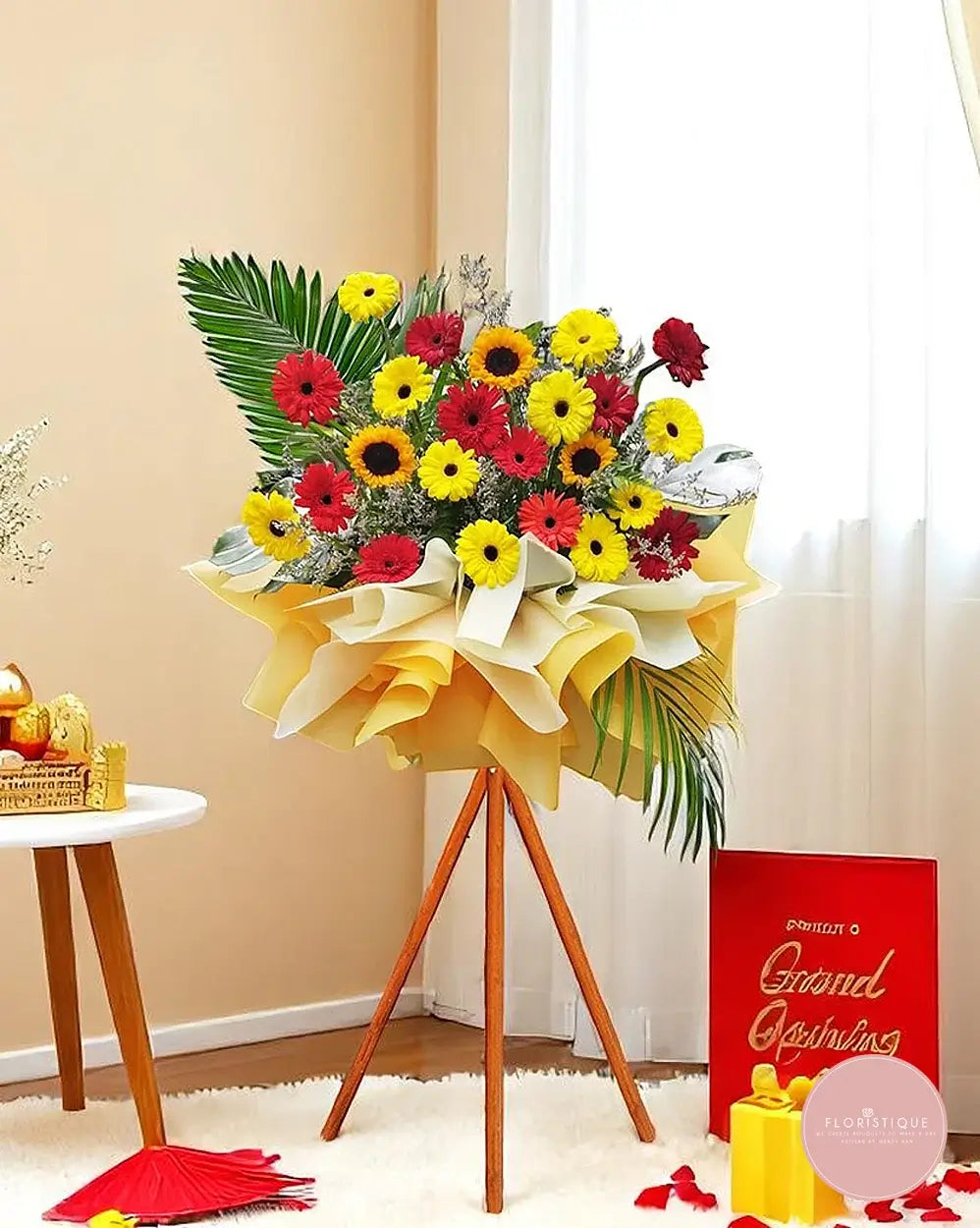 Bursting with cheerful red and yellow gerberas, this grand opening flower stand is a vibrant display of joy, energy, and celebration. Accented with lush greens and wrapped in bright yellow tones, it brings a sunny disposition to any business milestone or congratulatory event.