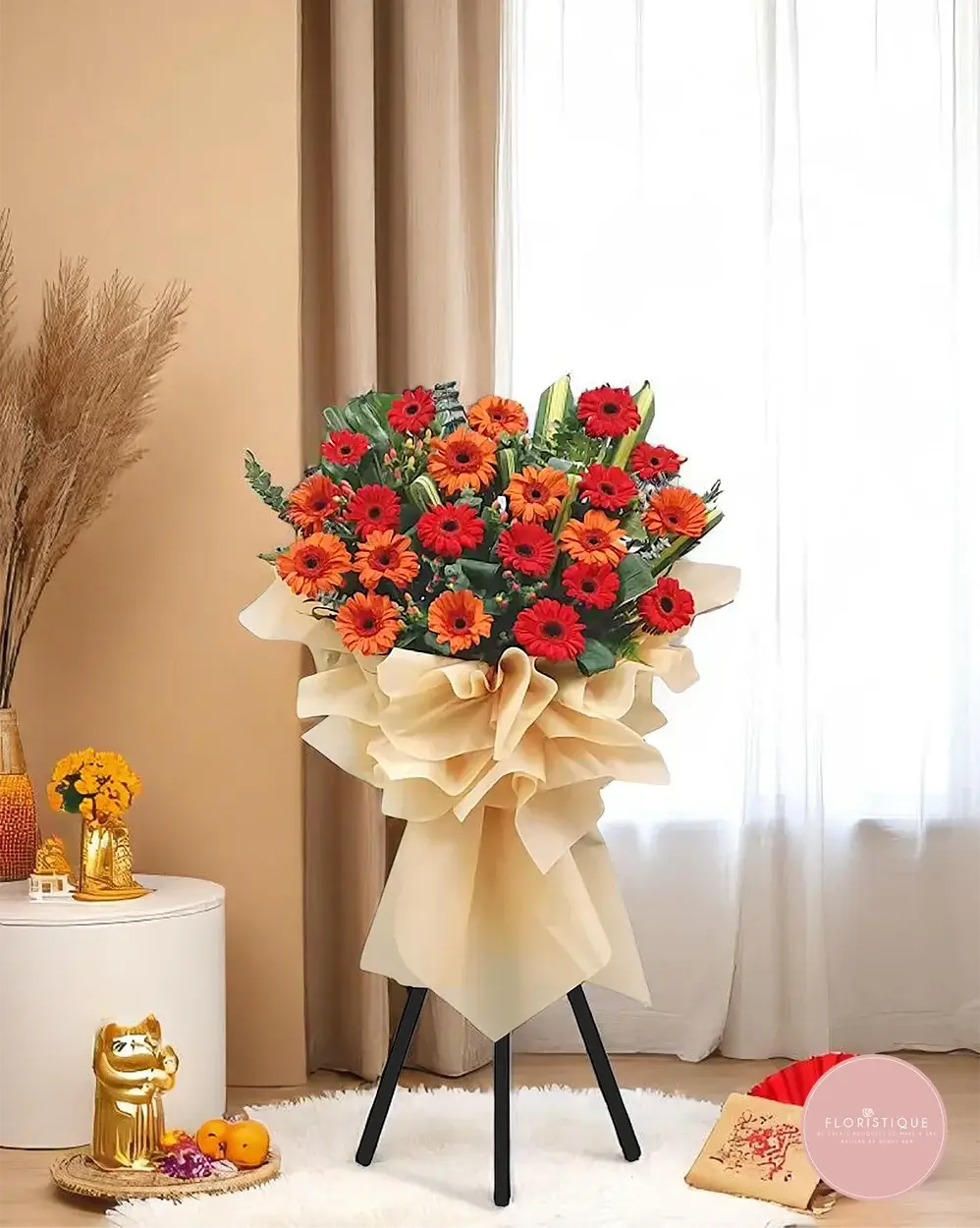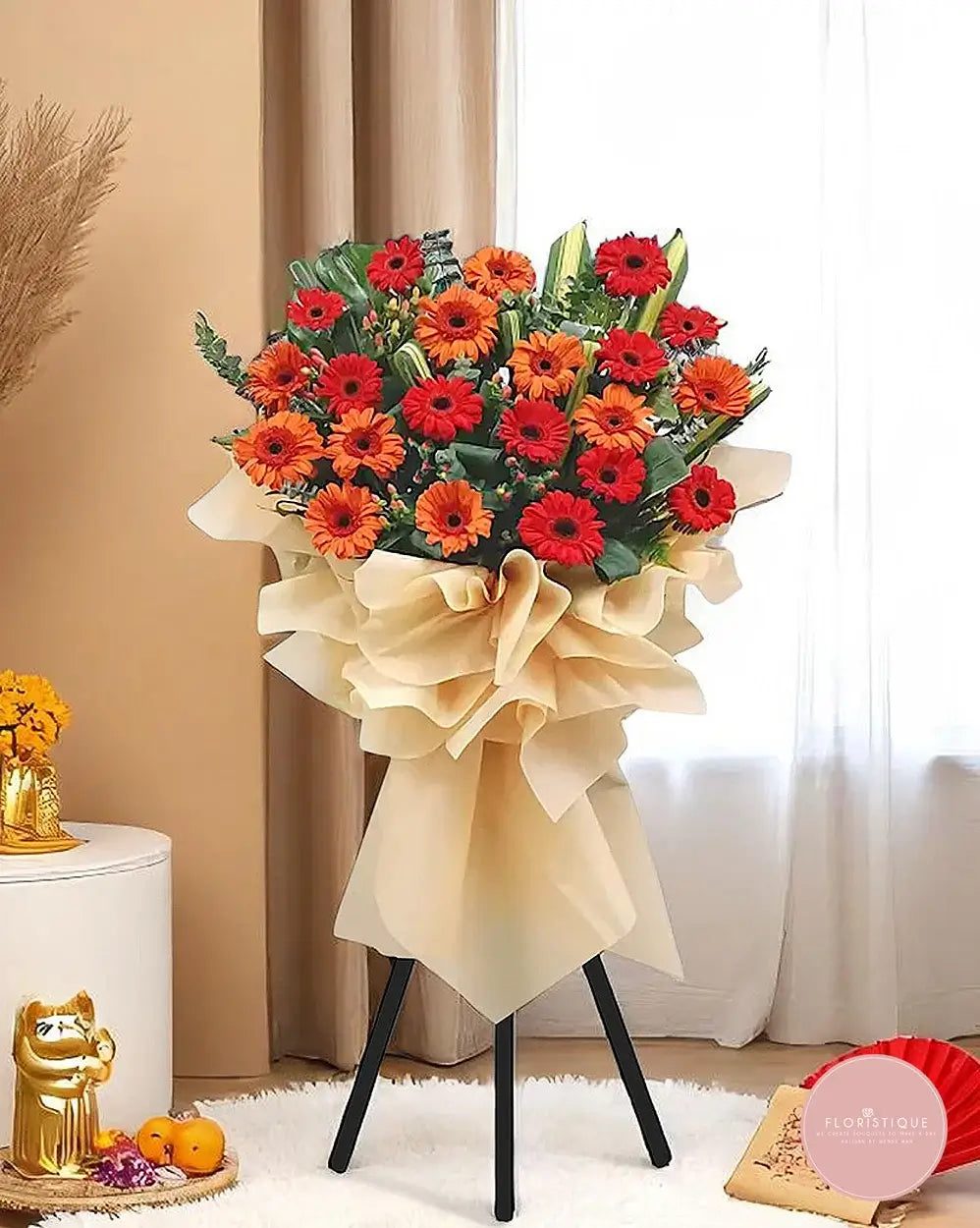 Make a bold entrance with this striking grand opening flower stand, featuring a dynamic mix of red and orange gerberas surrounded by fresh greenery. Wrapped in soft beige with elegant folds, this arrangement symbolizes passion, vitality, and a vibrant start.