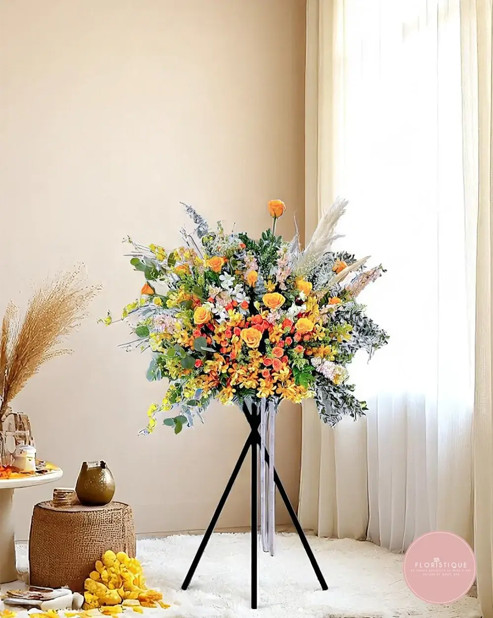 Radiating warmth and elegance, this grand opening flower stand showcases a lush arrangement of yellow roses, orchids, daisies, and golden fillers, complemented by soft pampas and eucalyptus. Its airy yet full-bodied design symbolizes optimism, abundance, and the promise of a flourishing journey ahead.