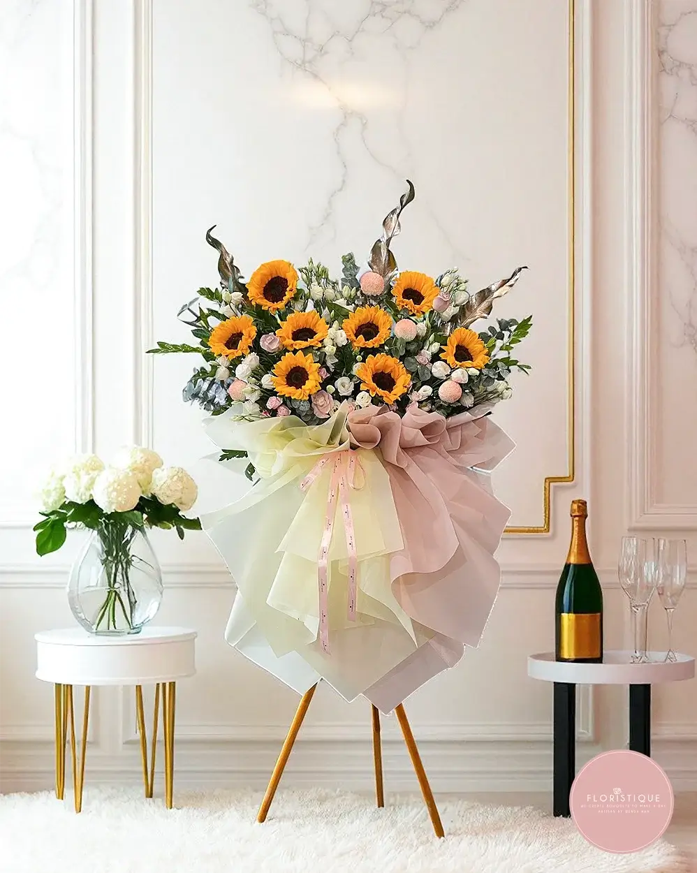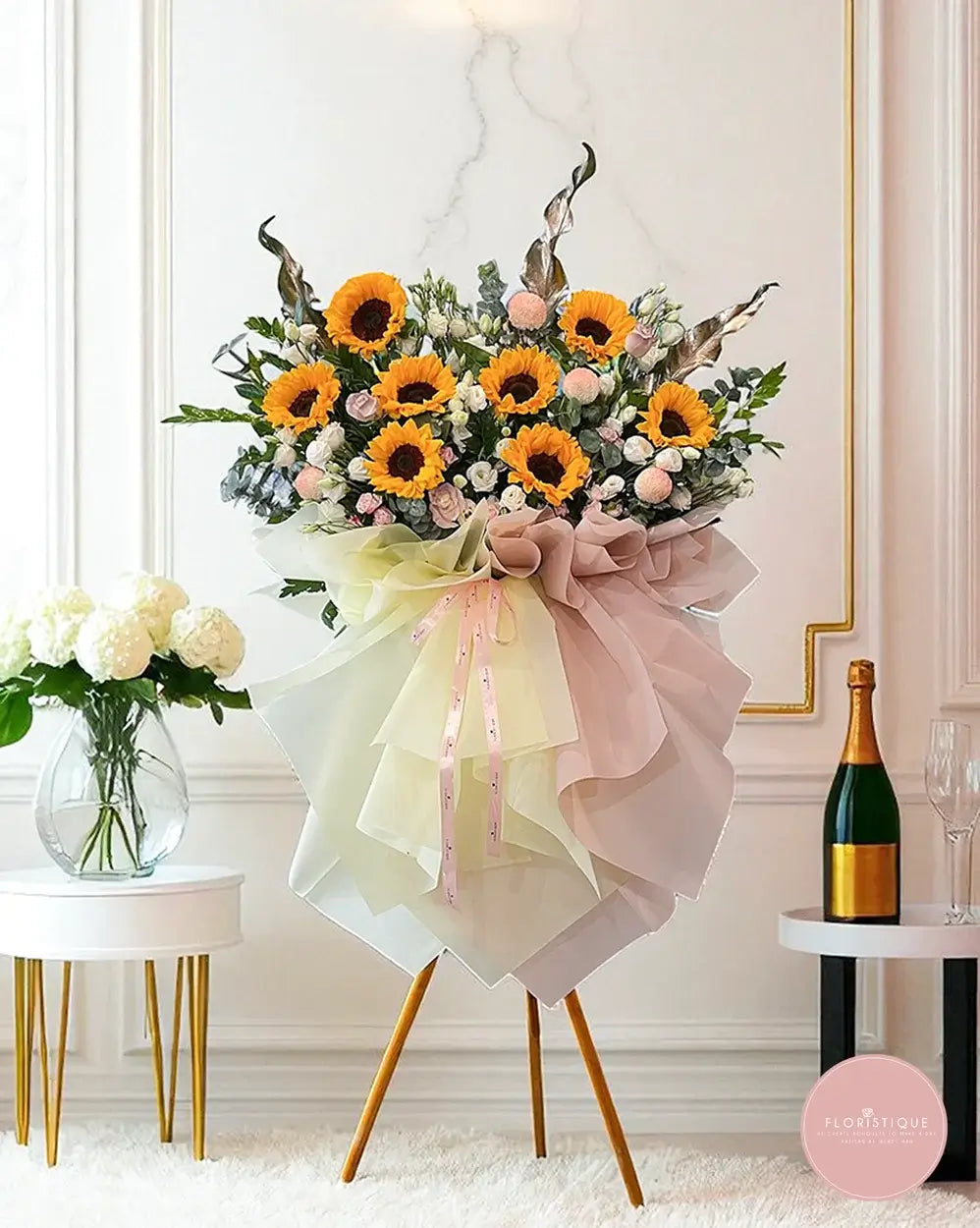 Bright and uplifting, this grand opening flower stand features radiant sunflowers, soft pink roses, and elegant white eustomas, accented with lush greens and shimmering gold leaves. Wrapped in layers of buttery peach fabric with a delicate pink ribbon, it’s a beautiful symbol of growth, joy, and new beginnings.