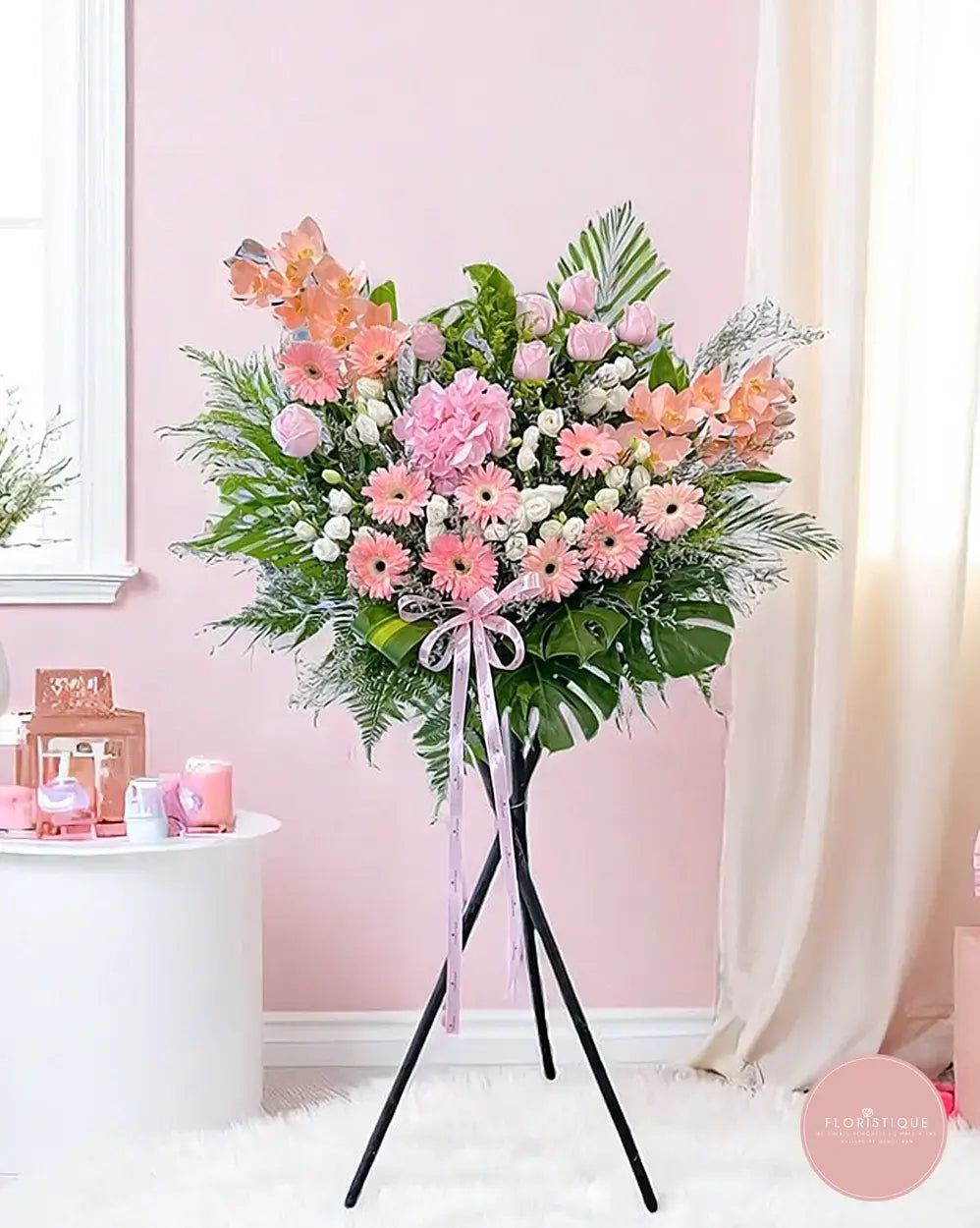 Delicate and graceful, this grand opening flower stand features a lovely medley of soft pink gerberas, roses, orchids, tulips, and a central hydrangea bloom. Surrounded by lush greenery and finished with a pink satin ribbon, this arrangement radiates elegance, warmth, and heartfelt celebration.