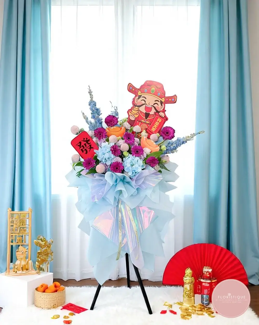 Bring vibrant energy and abundant blessings to any new venture with this eye-catching grand opening stand. Featuring a lively blend of rich purple chrysanthemums, powder blue hydrangeas, peach-toned anthuriums, and whimsical fillers, it's topped with a cheerful Caishen (God of Wealth) and auspicious red "發" tags—symbols of wealth and success.