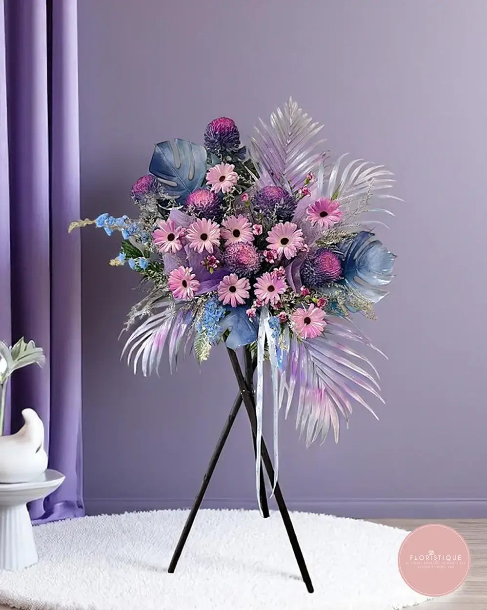This bold and luxurious grand opening stand features an artistic blend of preserved thistles, pink gerbera daisies, and dyed purple-blue foliage, set against dramatic fan-shaped palm leaves and soft silver sprigs. The cool-toned palette evokes a sense of modern elegance and creative flair, making it a standout piece for any business launch or celebratory event. Thoughtfully styled with curated textures and preserved elements, this arrangement brings a long-lasting impression of sophistication and success.