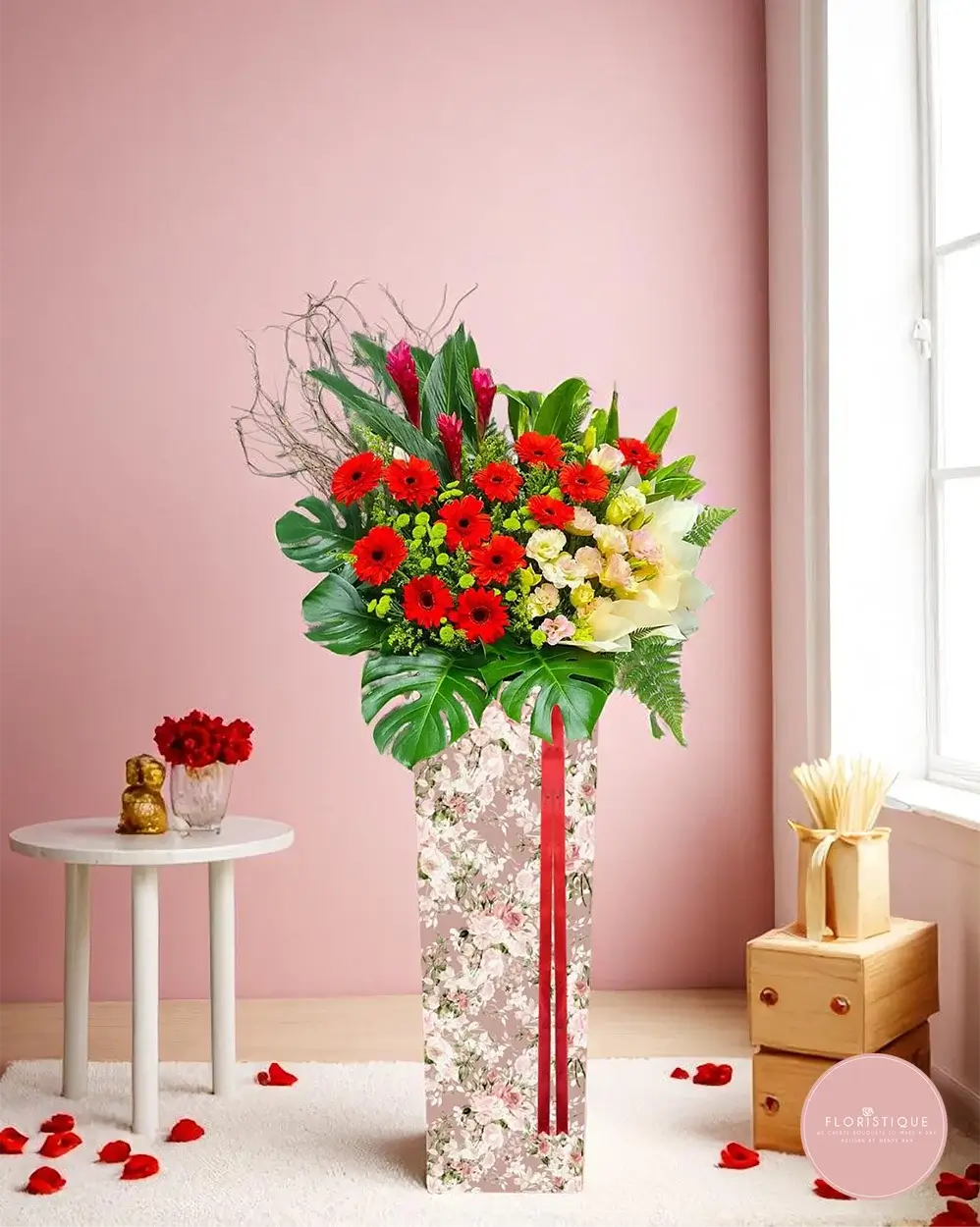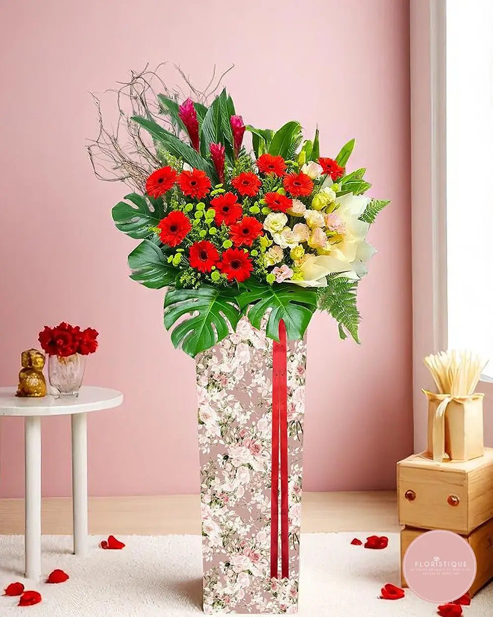 Vibrant and full of life, this grand opening flower stand features a bold arrangement of fiery red gerberas, yellow roses, and exotic ginger flowers. Accented with fresh foliage, curly twigs, and nestled in a romantic floral-patterned stand with a rich red ribbon, this design exudes energy, enthusiasm, and success.