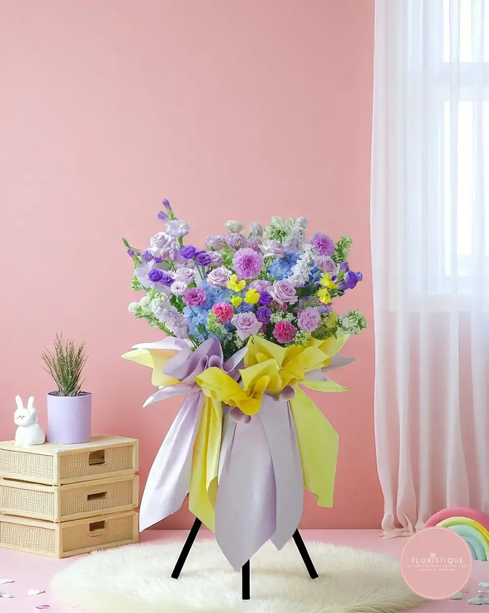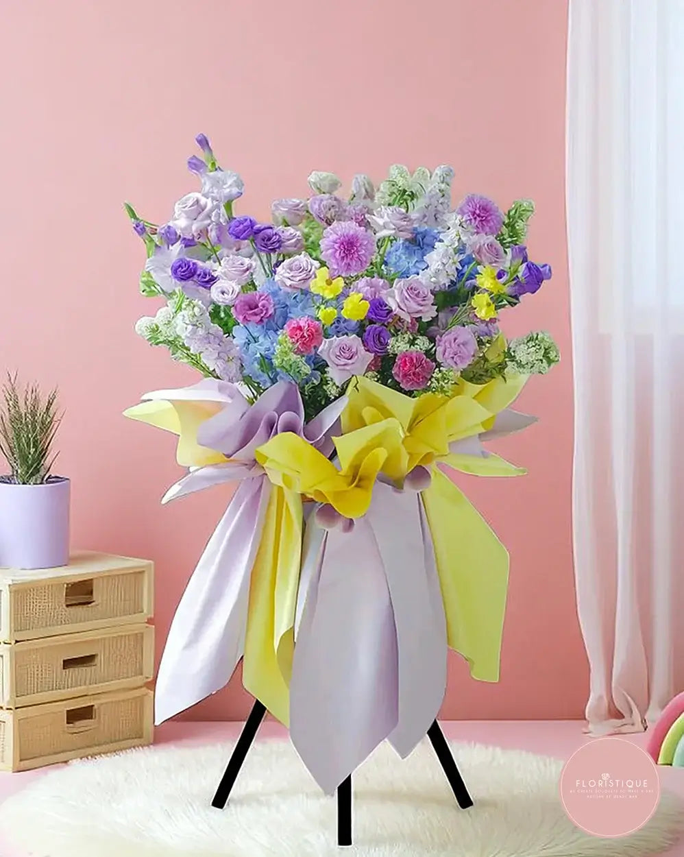 Soft, whimsical, and full of charm, this grand opening flower stand features a delicate blend of lilac roses, lavender eustomas, light blue statice, and yellow accents. Wrapped in pastel yellow and lilac fabric with elegant folds, this arrangement evokes serenity, creativity, and heartfelt celebration.