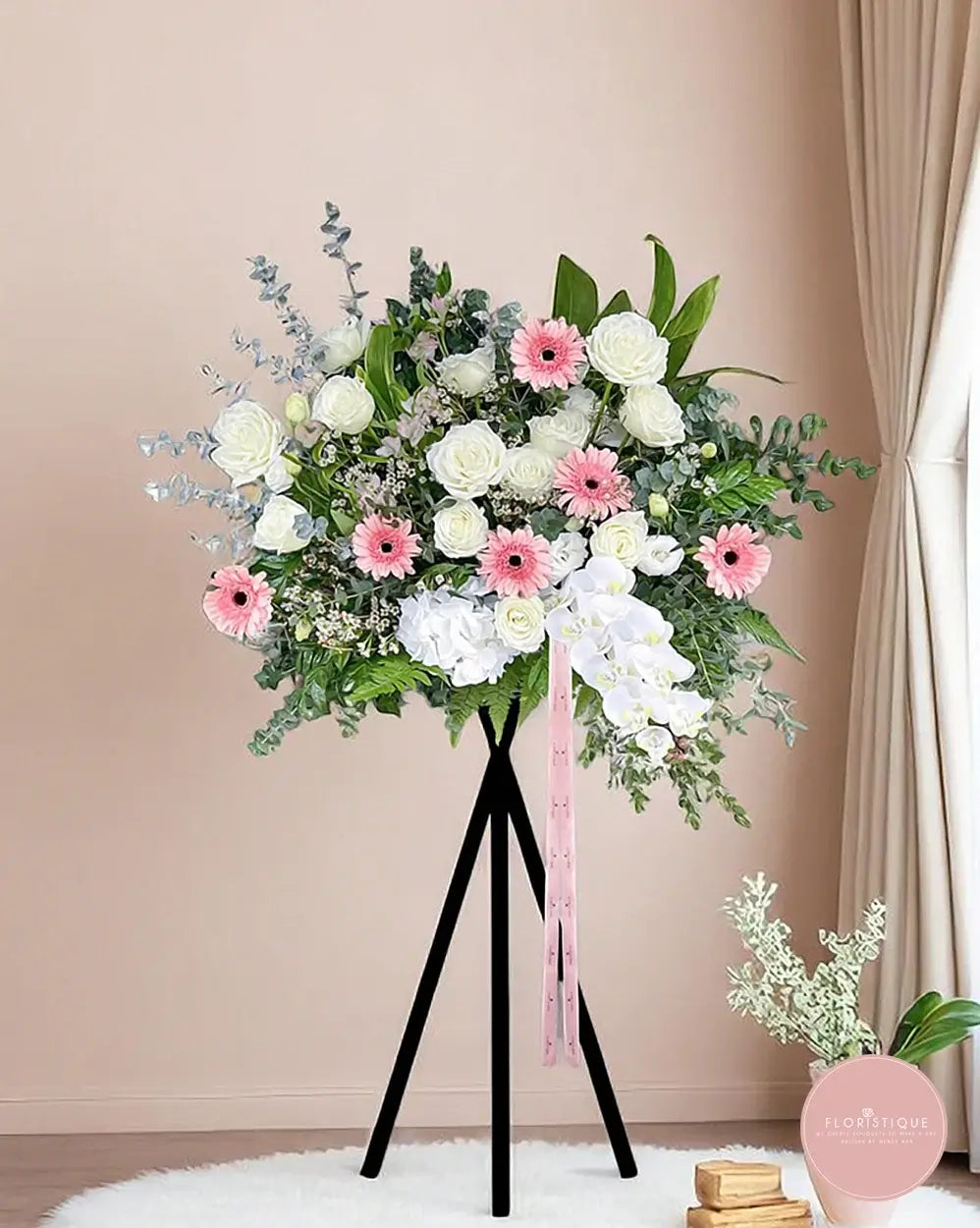 This elegant arrangement blends soft blush pink gerberas, pristine white roses, and cascading orchids with lush greenery, radiating peace and grace. Perfectly balanced, it brings a refined touch to grand openings or heartfelt celebrations.