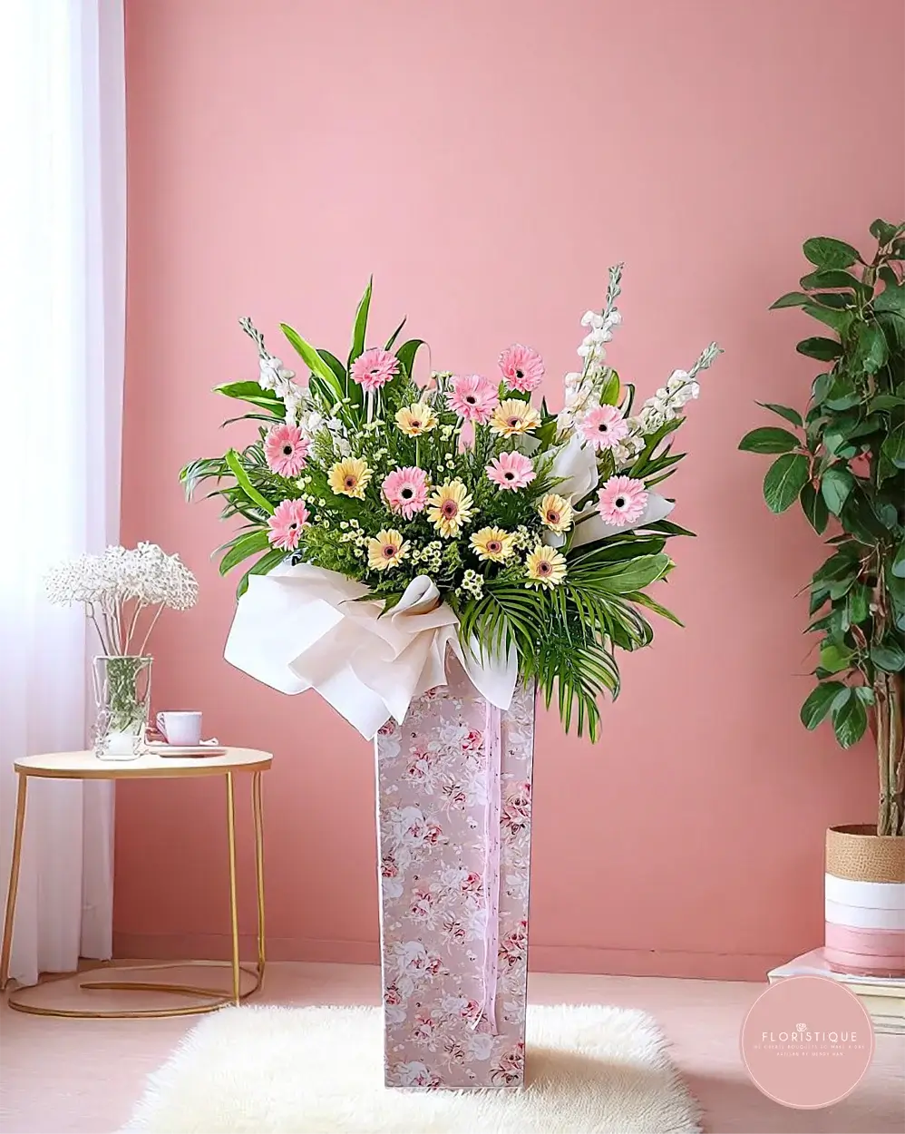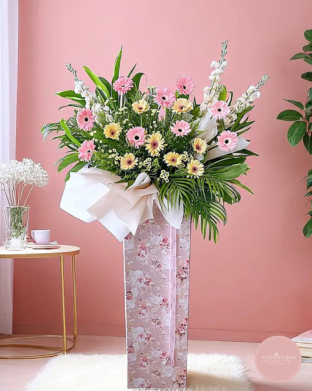 Radiating charm and freshness, this sweet arrangement features soft pink and yellow gerberas nestled among verdant foliage and elegant white snapdragons. The floral-patterned stand adds a touch of grace, making it a thoughtful gesture for any celebratory occasion.