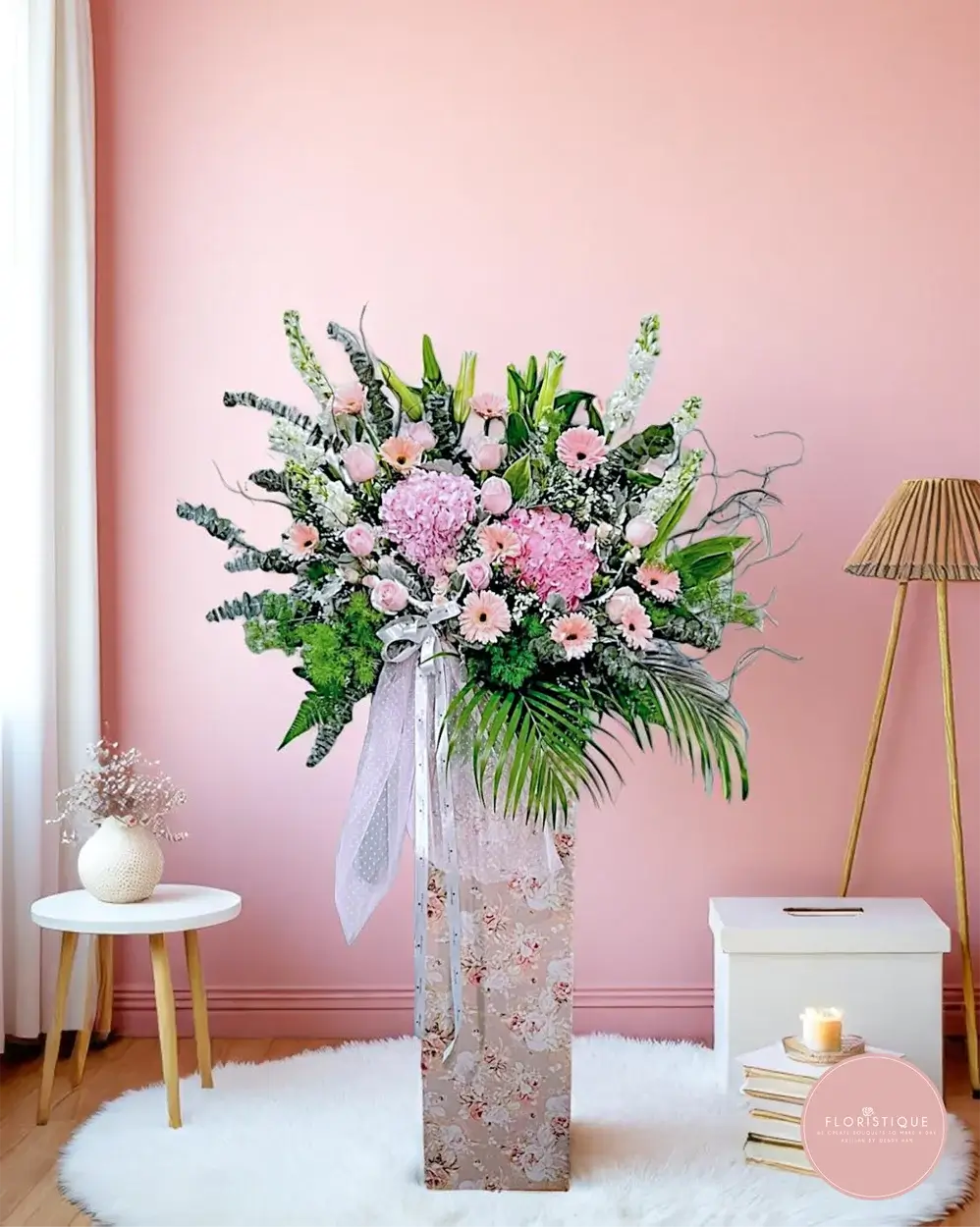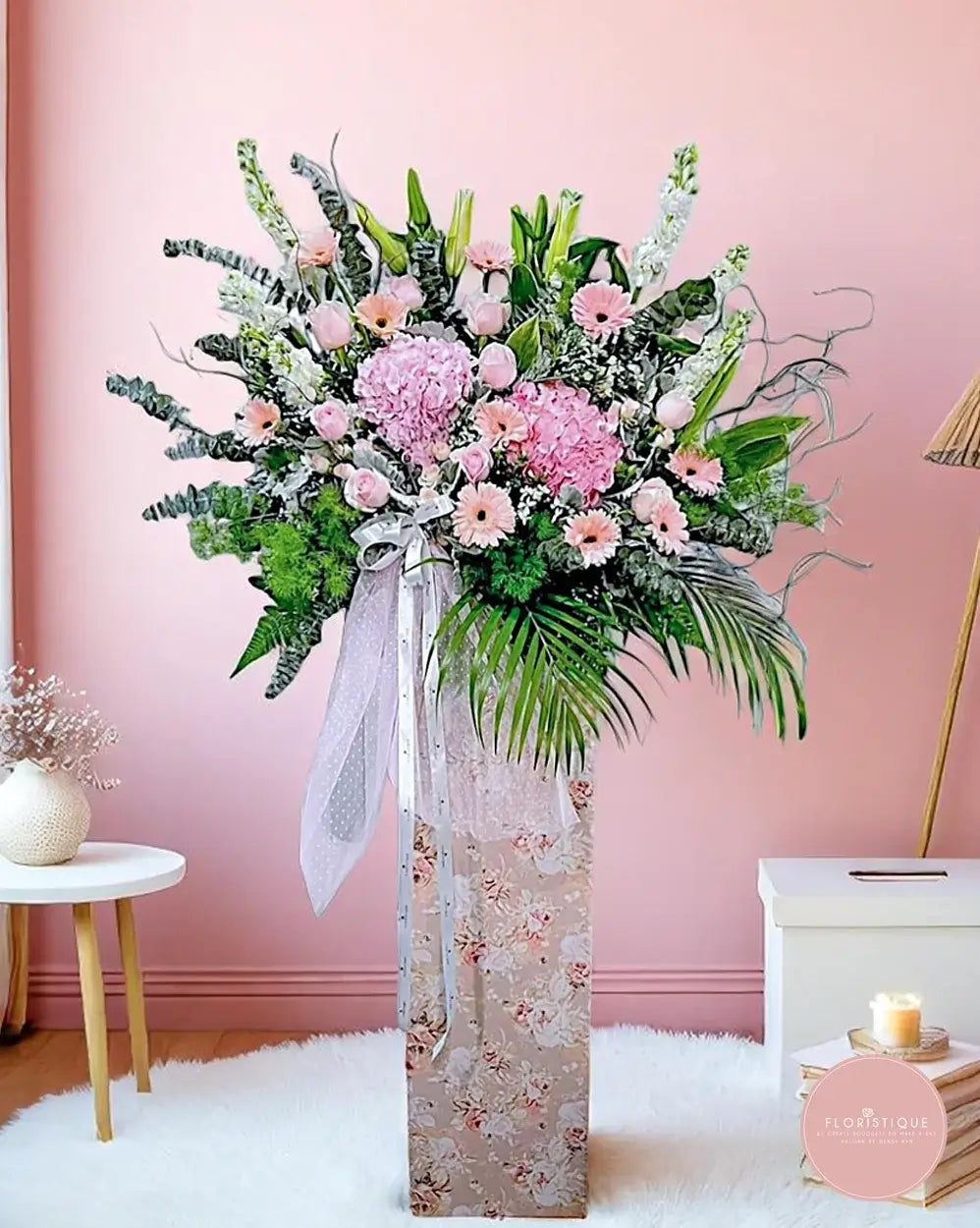 A serene arrangement of soft pink hydrangeas, tulips, and gerberas complemented by lush greens and textured eucalyptus. Delicately styled with a pastel floral wrap, this stand expresses elegance and warmth — perfect for grand openings or heartfelt wishes.