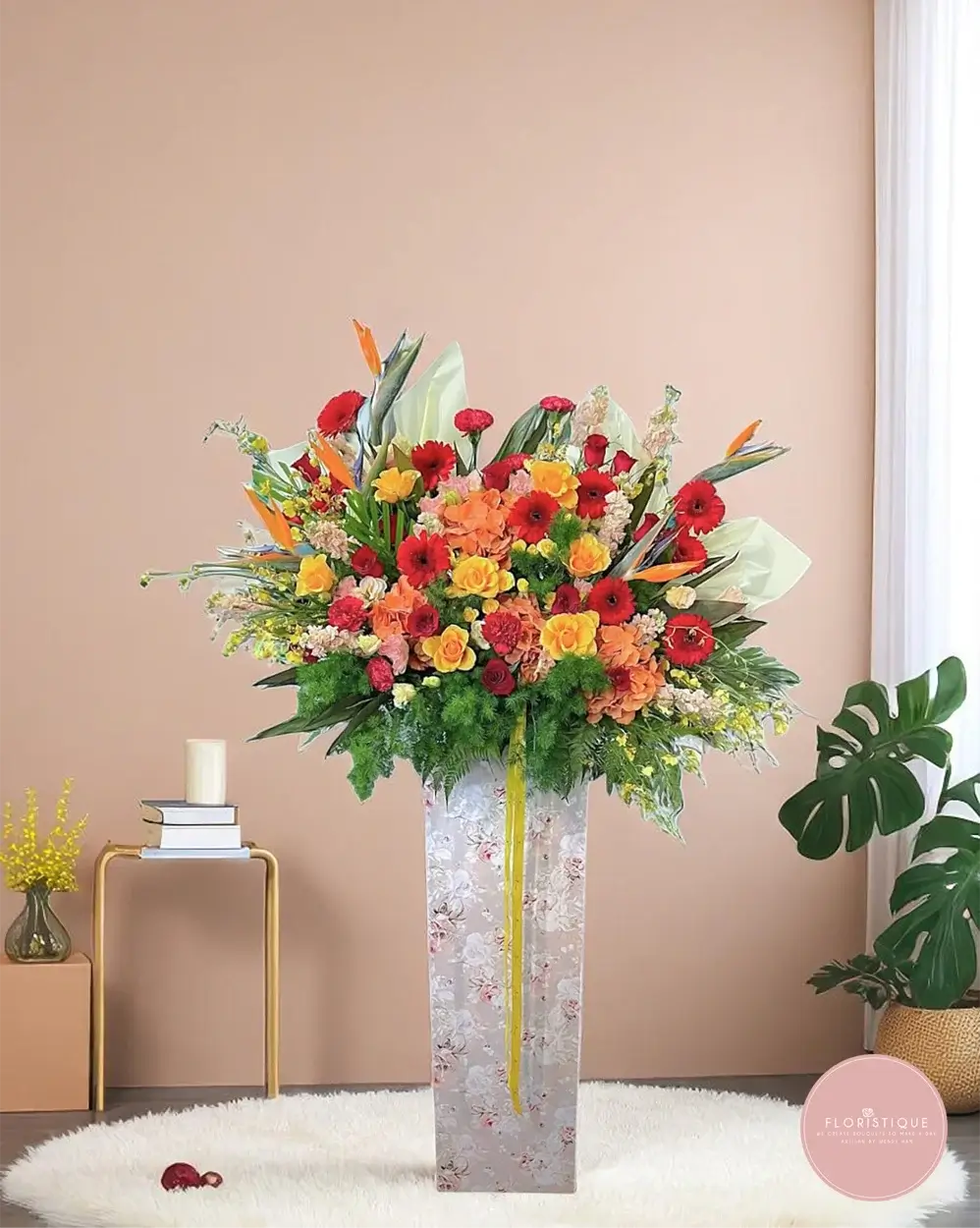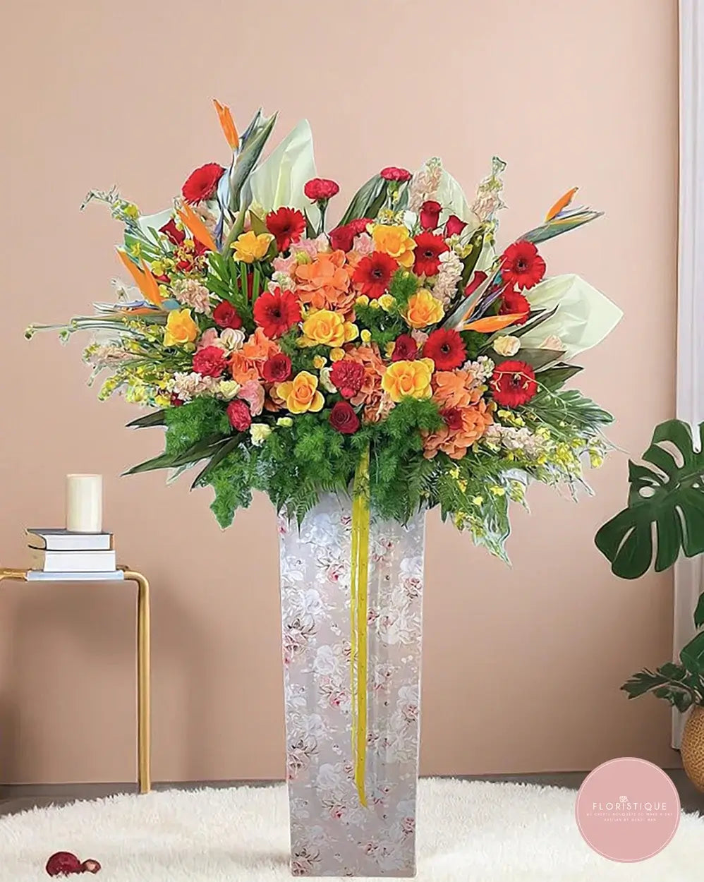 Bursting with energy and colour, this vibrant arrangement showcases a powerful mix of orange roses, red gerberas, and exotic birds of paradise. Accented with lush greenery and golden yellow highlights, it's a bold expression of success and new beginnings—perfect for grand openings or celebratory events.
