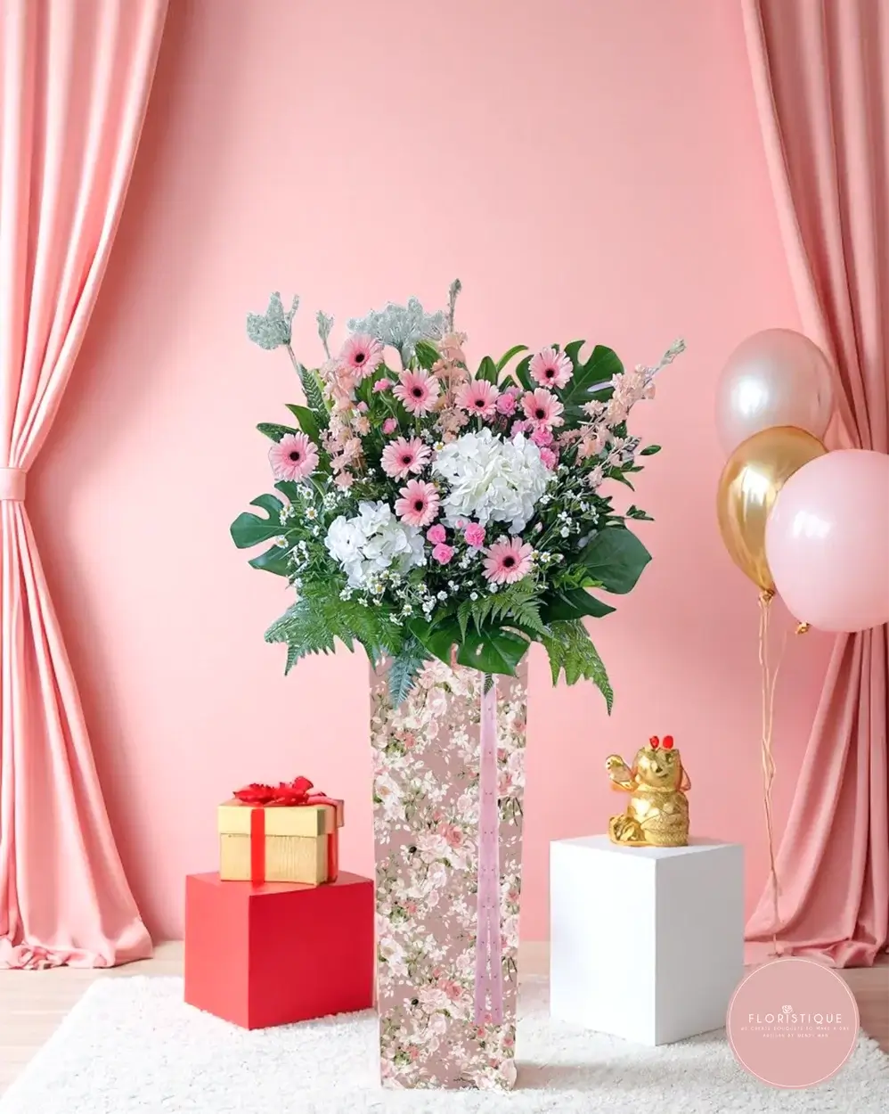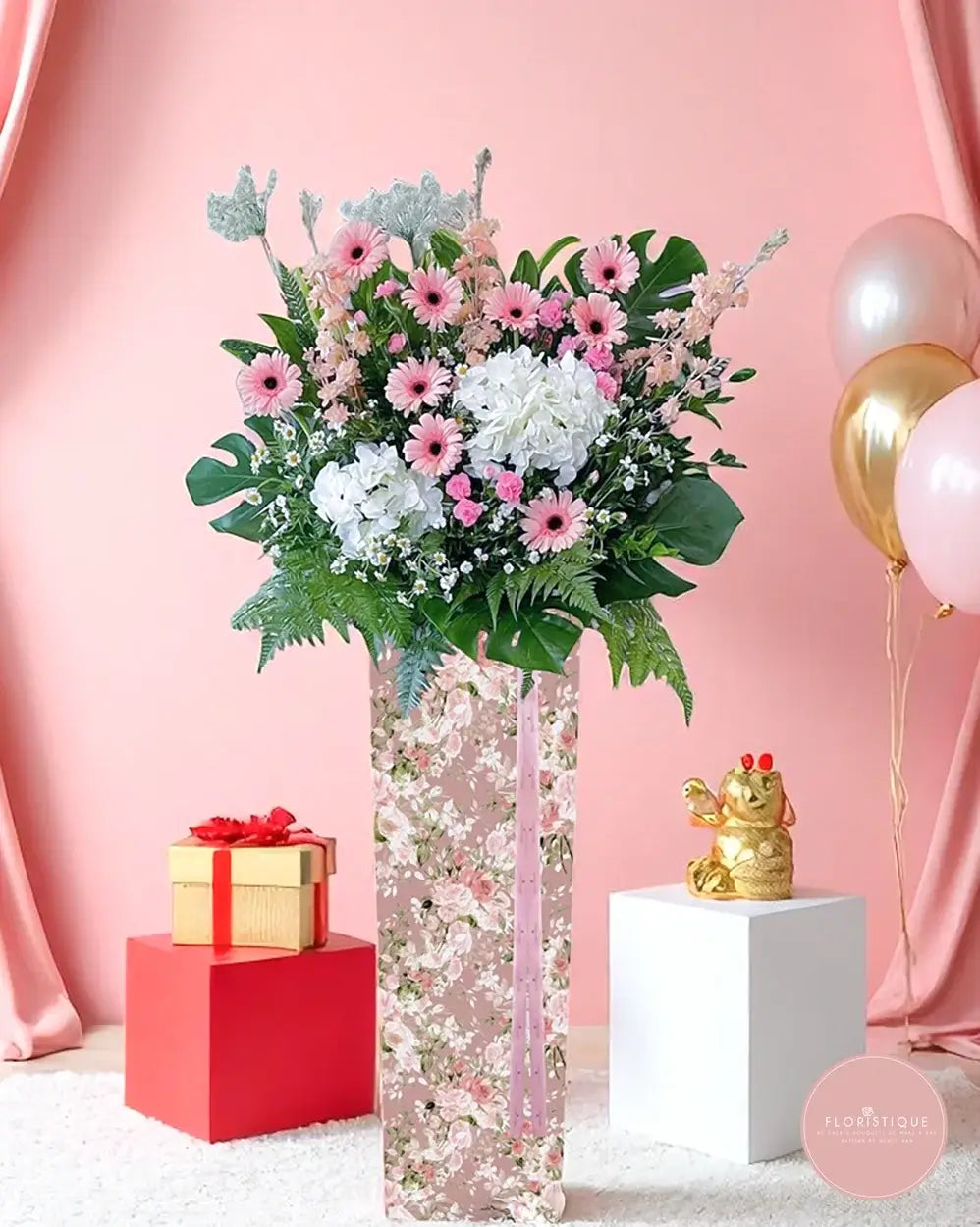 Radiating elegance and joy, this grand opening flower stand features cheerful pink gerberas, lush white hydrangeas, soft baby’s breath, and delicate roses. Accented with monstera leaves and fresh ferns, and presented in a floral-patterned stand, it beautifully conveys heartfelt congratulations and celebrates new beginnings with grace. A popular choice for business openings and milestone events, this arrangement adds a refined touch to any grand celebration.