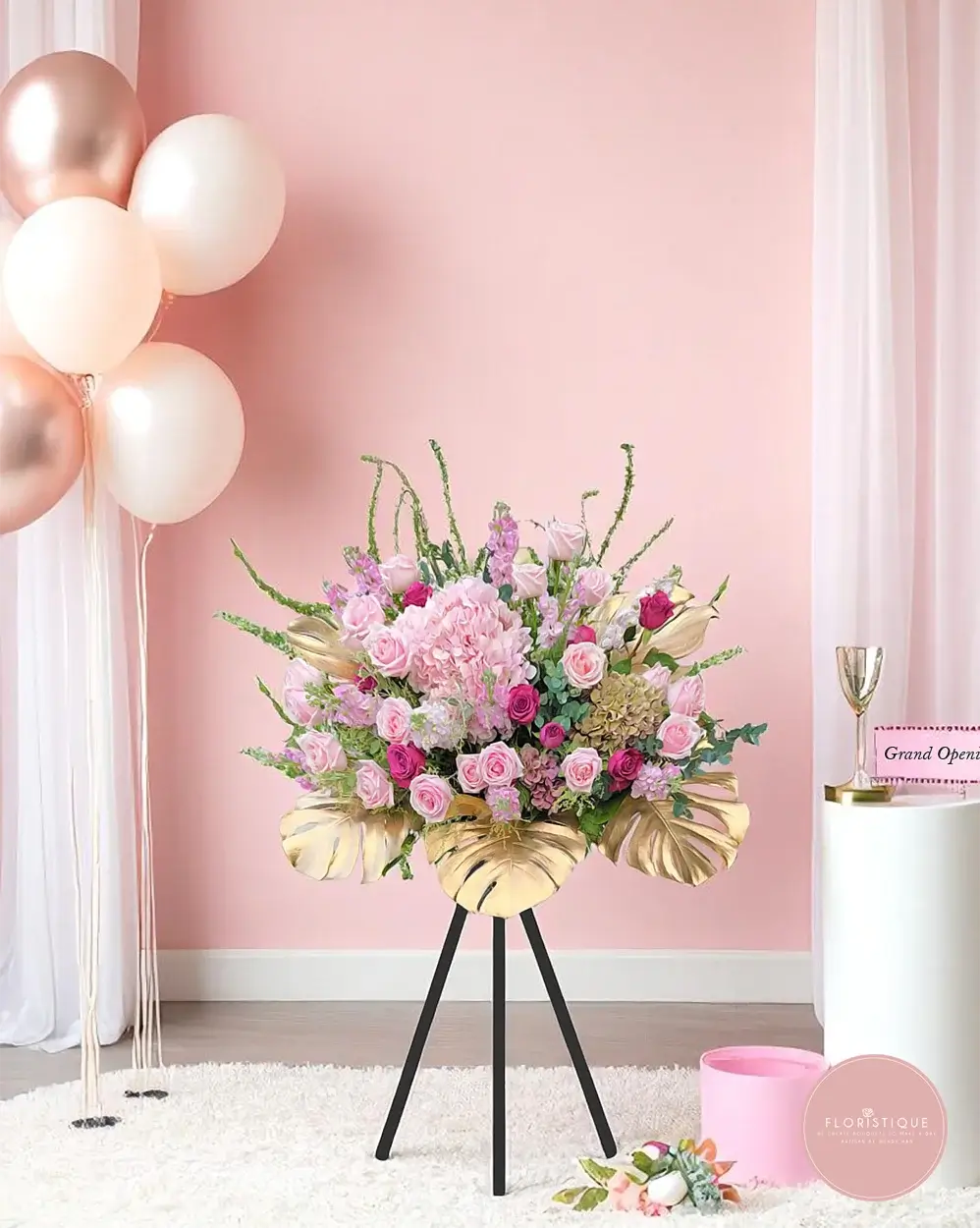 A luxurious composition of blush hydrangeas, pink roses, and magenta spray roses, artfully arranged with soft fillers and dramatic gold monstera leaves for a majestic finish. This grand opening stand radiates elegance and charm, perfect for celebrating new ventures in style.
