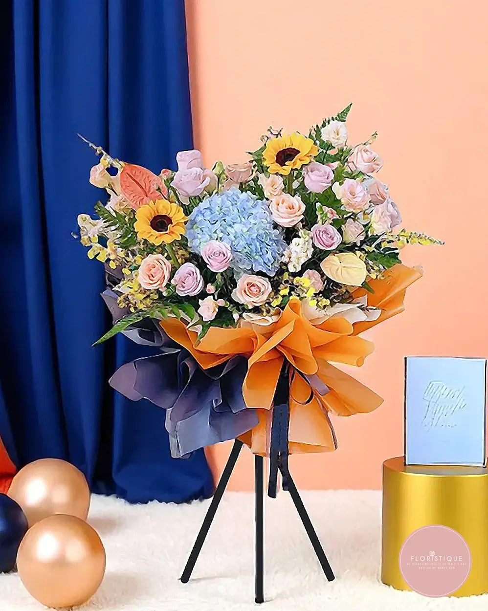 Celebrate new beginnings with this radiant arrangement featuring cheerful sunflowers, soft blush roses, and a show-stopping hydrangea centerpiece in powder blue. Accented with vibrant orange anthuriums and golden yellow sprigs, this floral stand is wrapped in bold orange and midnight-toned paper for a striking contrast.