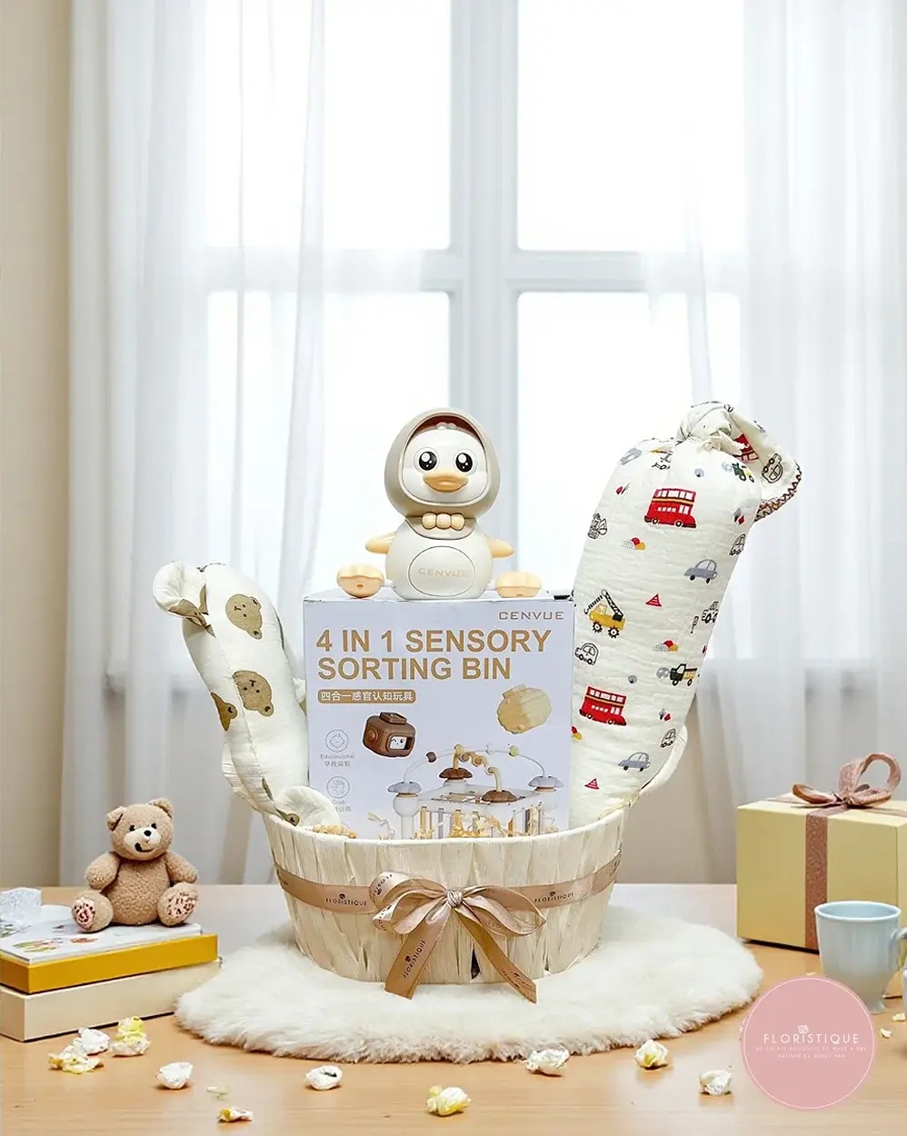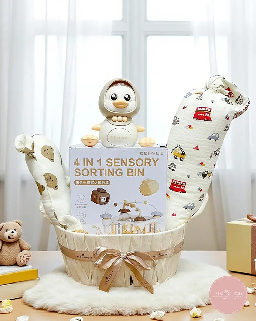 A unique baby hamper combining both comfort and play for the little one. This set includes a 4-in-1 sensory sorting bin toy for early learning, an adorable penguin-themed rattle toy, a soft bolster and pillow — all neatly arranged in a woven basket and tied with a satin ribbon. Thoughtfully curated, it blends fun, practicality, and care in one charming gift.