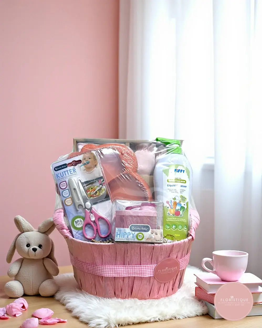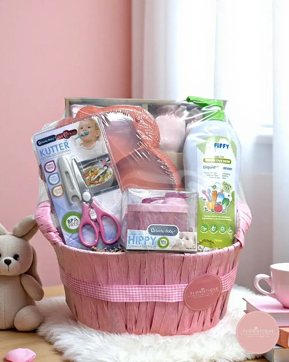 A thoughtful baby hamper filled with everyday essentials for newborn care. This set includes a baby clothing set, mittens, a feeding bowl, BPA-free baby scissors, baby wipes, and a baby-safe liquid cleanser — all neatly presented in a pink woven basket and finished with a gingham ribbon bow. Both practical and caring, it’s a gift that new parents will truly appreciate.