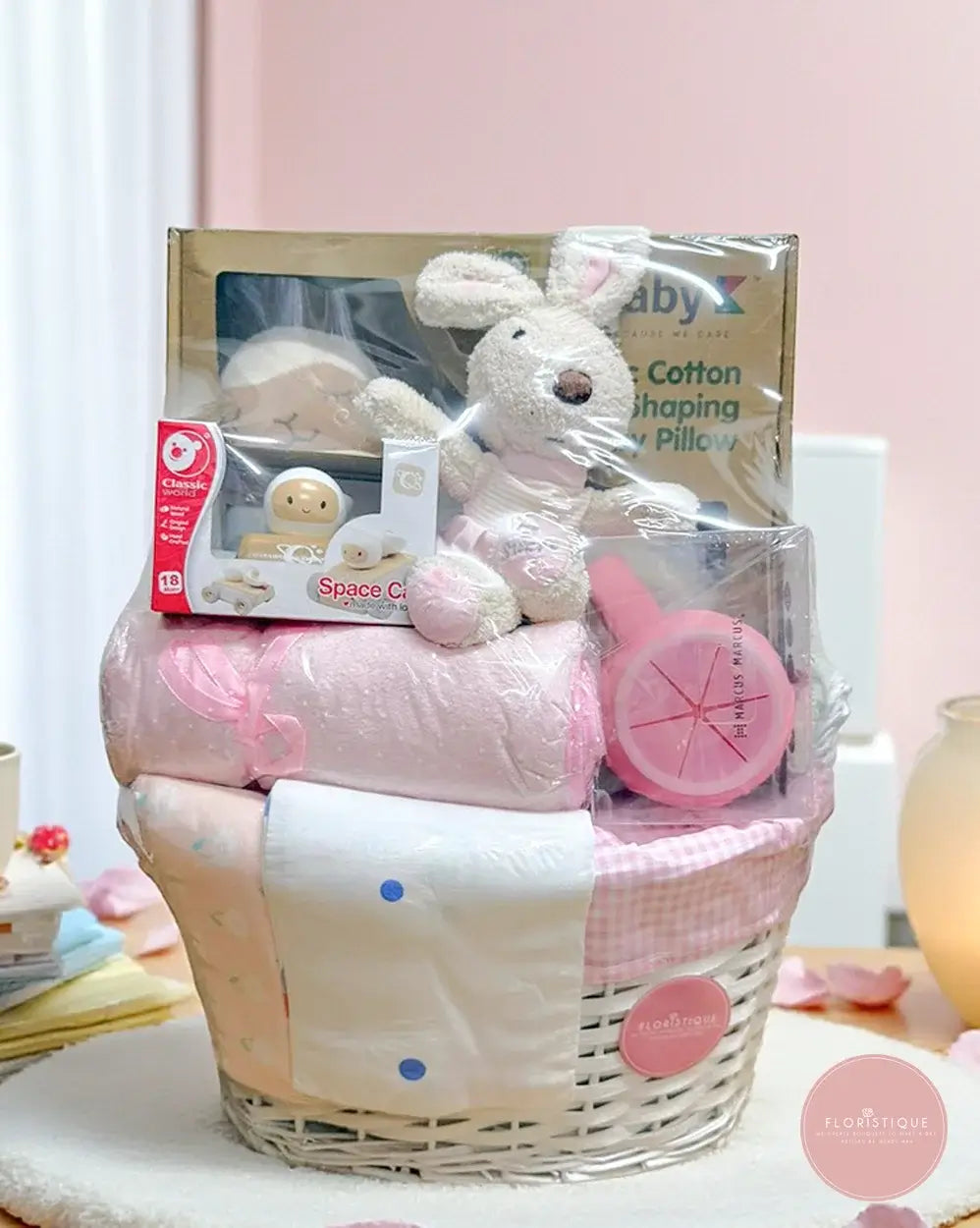 A charming baby hamper designed to welcome a baby girl with both comfort and joy. This thoughtful set includes a soft plush bunny toy, a cotton baby pillow, a cozy baby blanket, swaddle cloths, a milk powder dispenser, and other newborn essentials — all beautifully presented in a classic white woven basket lined with pink gingham fabric and finished with a satin ribbon.