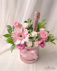 Gerberra . Roses . Spray Roses . Eustomas . Fillers & Foliage . 20cl Moet Champagne