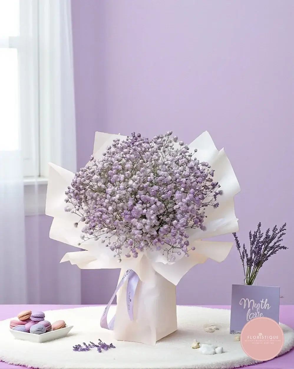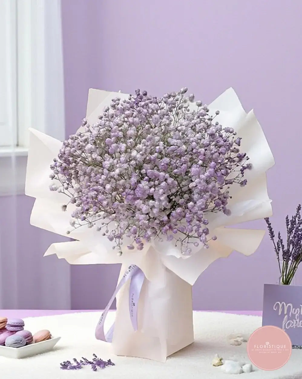 Delicate and dreamy, this enchanting bouquet features a cloud-like cluster of lavender and white baby’s breath, elegantly wrapped in soft white paper and tied with a satin lavender ribbon. Its pastel palette and airy charm make it a timeless gift for those who appreciate quiet elegance.