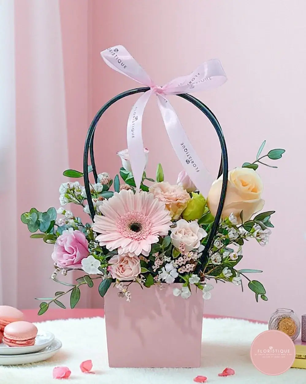 Delicate and delightful, this blush-toned floral bag is brimming with soft beauty. Featuring a gentle pink gerbera, peach rose, eustomas, spray carnations, and wax flowers, all accented with lush eucalyptus, this arrangement is elegantly presented in a pink carrier bag finished with a dainty ribbon bow.
