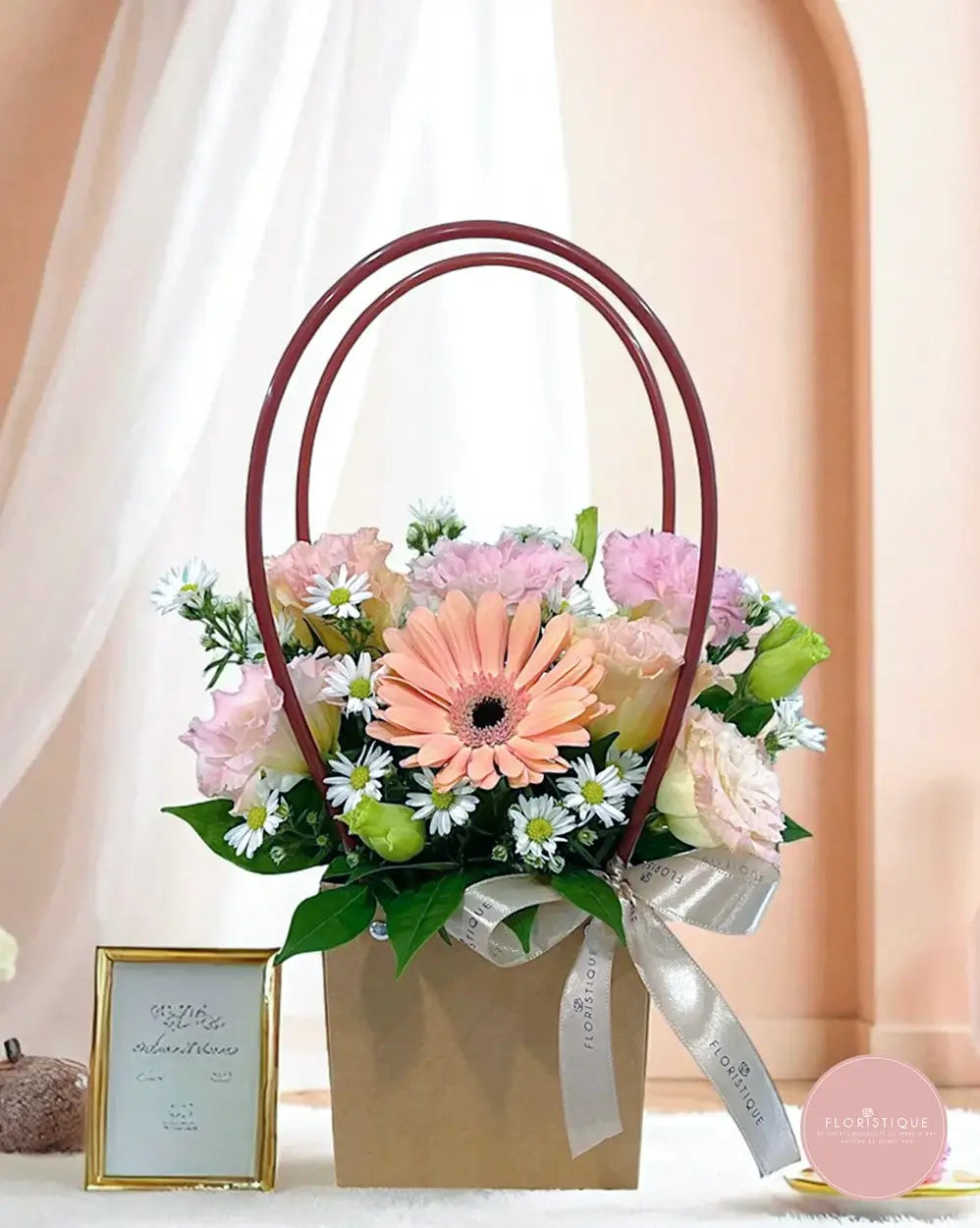 Soft, sweet, and full of charm — this floral bag features a delicate peach gerbera nestled among blush pink carnations, eustomas, and dainty white daisies. Arranged in a rustic kraft carrier and finished with a satin ribbon, it’s a delightful way to brighten someone’s day with love and cheer.