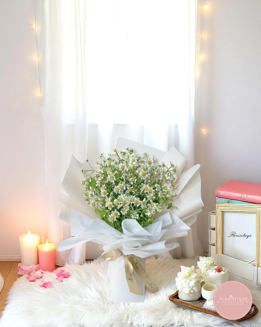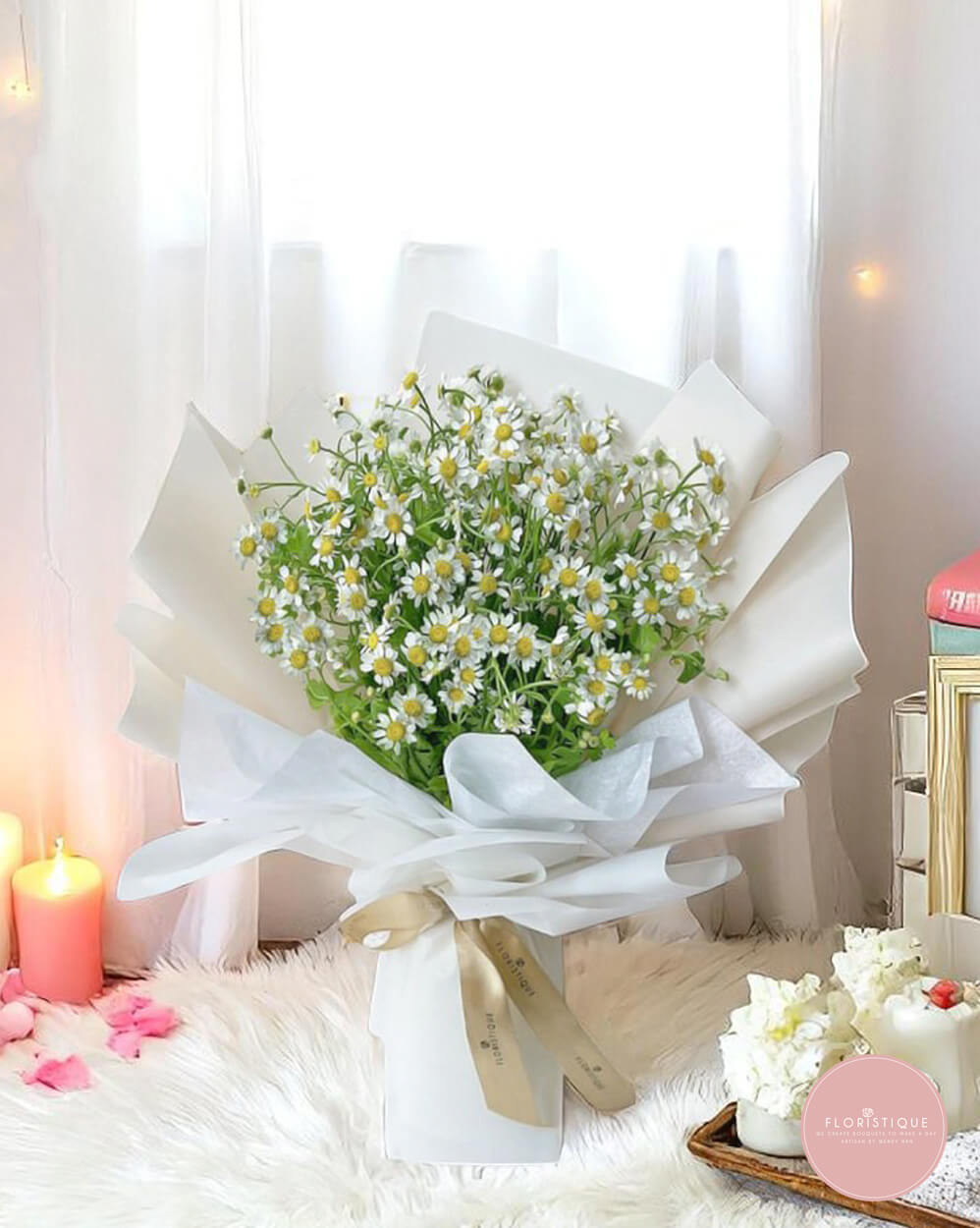 Fresh, airy, and effortlessly charming, this bouquet features a generous cluster of chamomile daisies wrapped in soft white layers and tied with a champagne satin ribbon. Its gentle fragrance and natural beauty evoke the calm of a sunlit field.