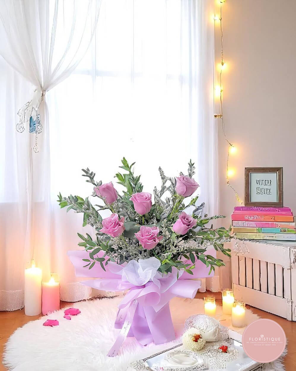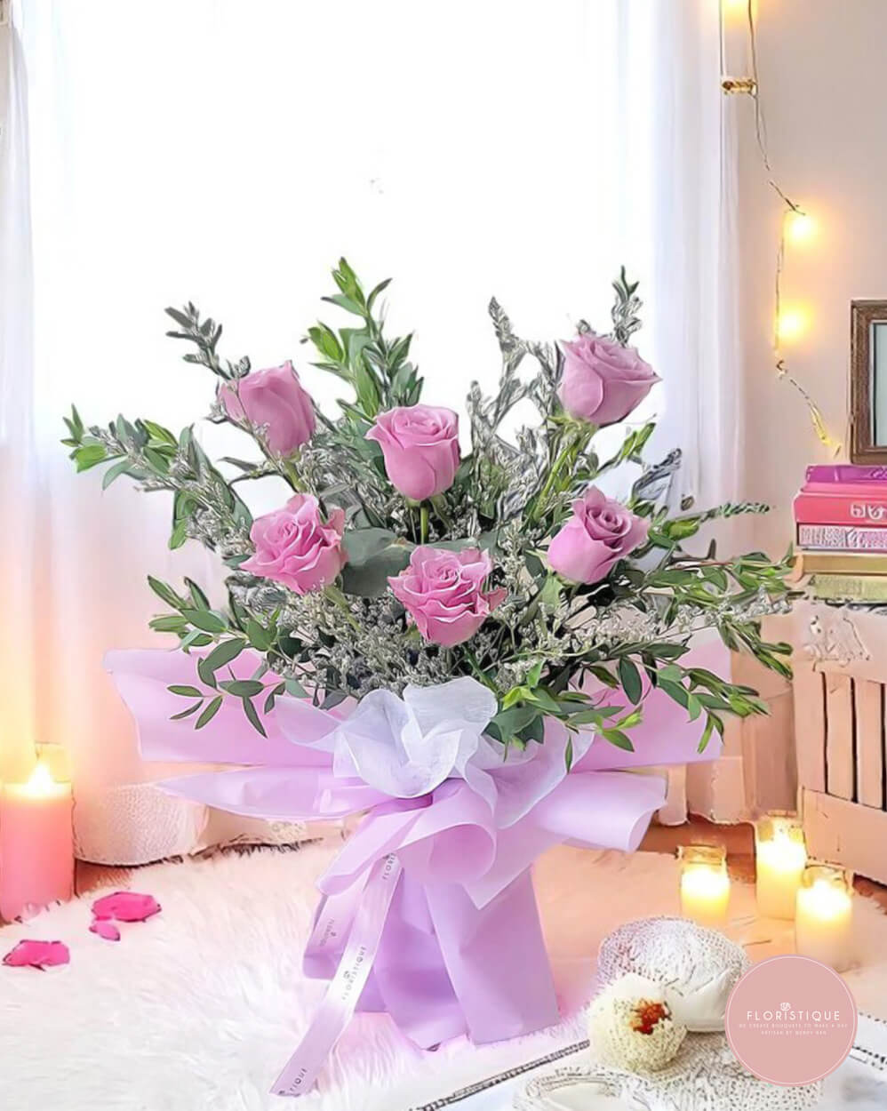 Ethereal and enchanting, this bouquet features seven lavender roses framed by wisps of silver fillers and fresh greenery. Wrapped in soft lilac and white layers with a delicate satin ribbon, it’s a poetic expression of admiration, elegance, and quiet affection.