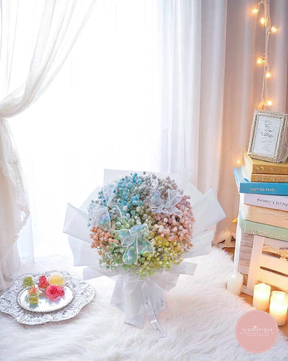 A delightful burst of colour, this bouquet features a rainbow spectrum of pastel baby’s breath adorned with delicate butterfly accents. Wrapped in pristine white layers and finished with a soft satin ribbon, it’s a joyful expression of love, dreams, and positivity.