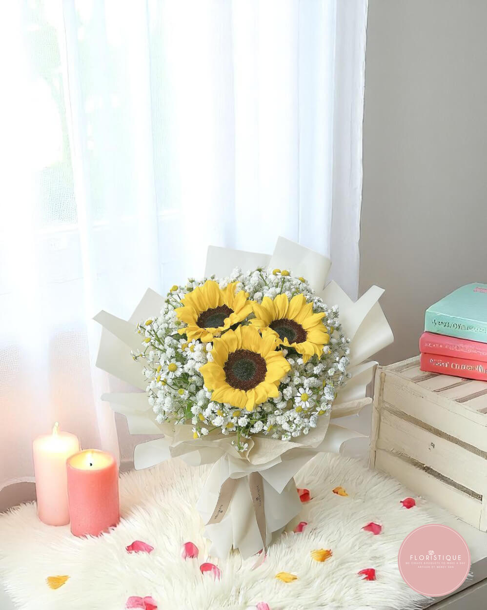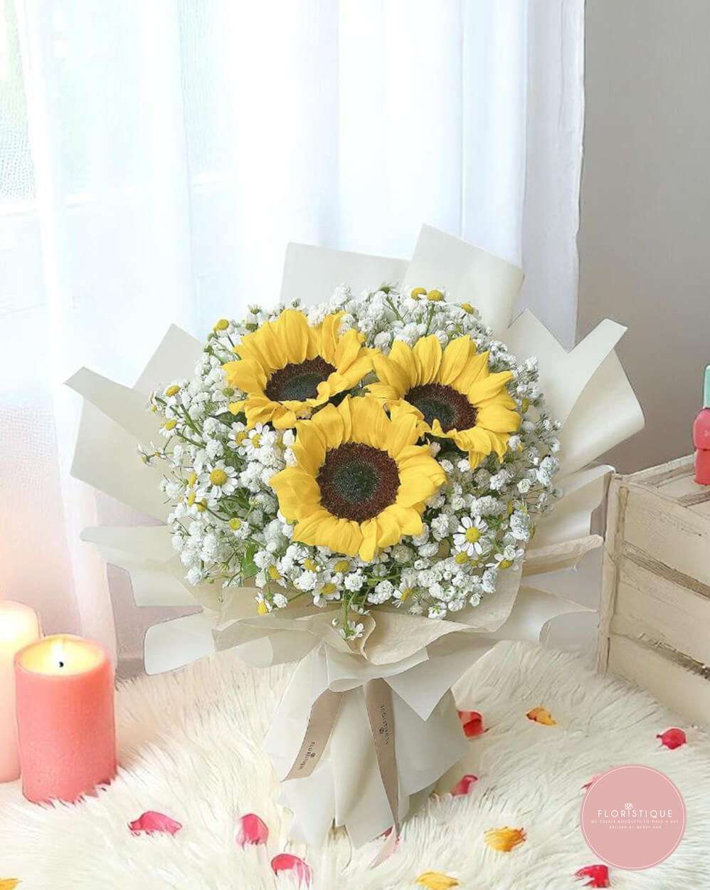 This radiant arrangement features three joyful sunflowers surrounded by a delicate halo of baby's breath and chamomile blooms. Wrapped in soft ivory-toned paper, this bouquet exudes warmth, simplicity, and charm—perfect for celebrating new beginnings or brightening any moment.