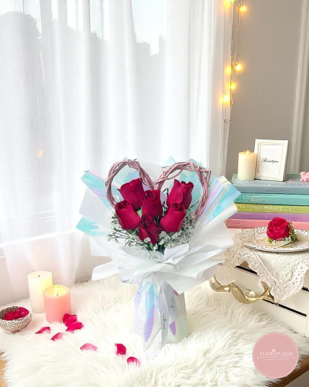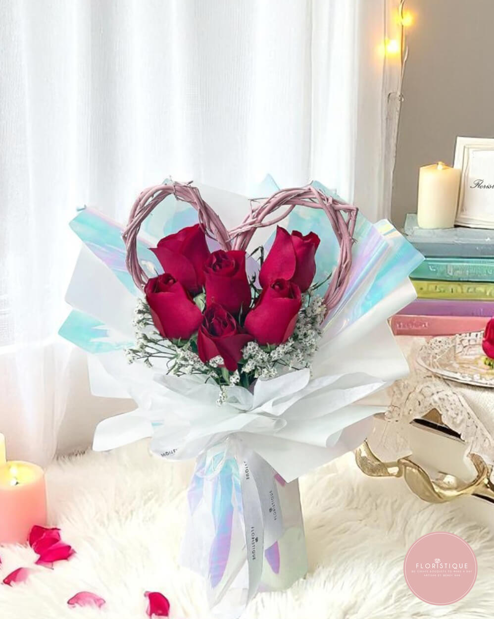 A romantic gesture wrapped in elegance, this bouquet features six velvety red roses cradled by soft baby’s breath and framed by a rustic pink heart. Finished with shimmering iridescent wrap and a satin ribbon, this design captures love’s purest form in a whimsical, fairytale presentation.