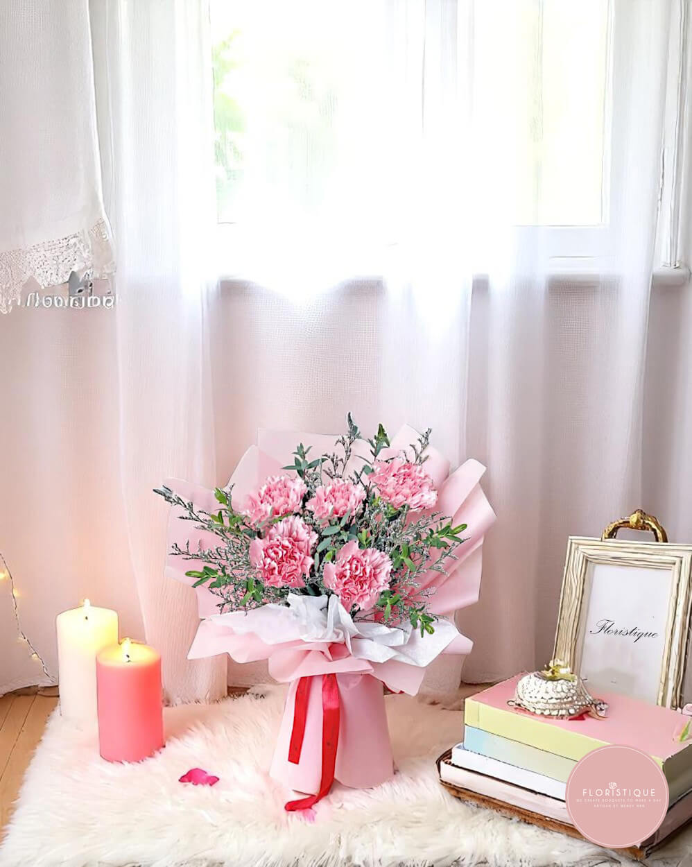 Delicate and full of warmth, this bouquet features a lovely array of soft pink carnations, artfully arranged with fresh fillers and greenery. Wrapped in pastel pink and white layers and tied with a vibrant red satin ribbon, it’s a gentle and graceful tribute to love and appreciation.