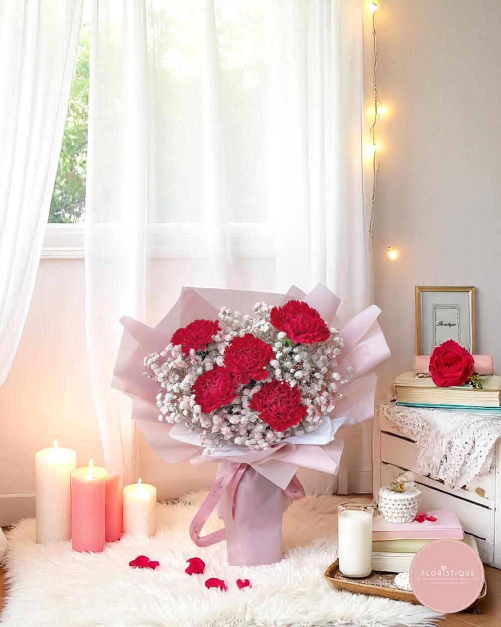 Bold and graceful, this bouquet features deep red carnations nestled among a cloud of delicate baby’s breath. Wrapped in soft blush pink paper and tied with a matching ribbon, it’s a classic yet heartwarming arrangement that conveys admiration, gratitude, and love.