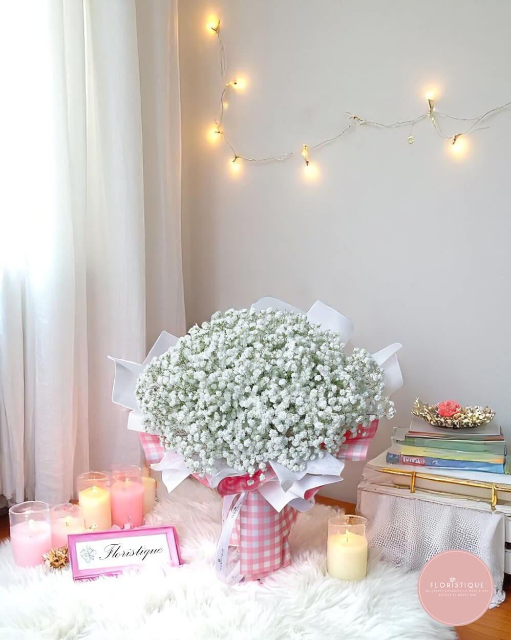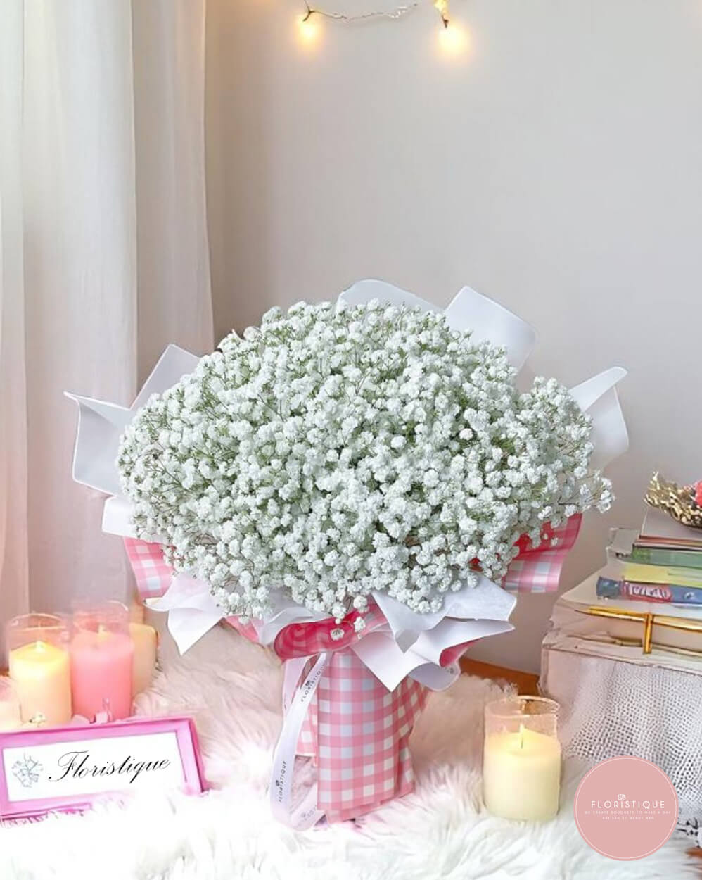 Sweet and whimsical, this bouquet features a cloud of pure white baby’s breath wrapped in playful pink gingham and white accents, finished with a satin ribbon. Light, airy, and effortlessly adorable, it adds a touch of rustic charm to any occasion.