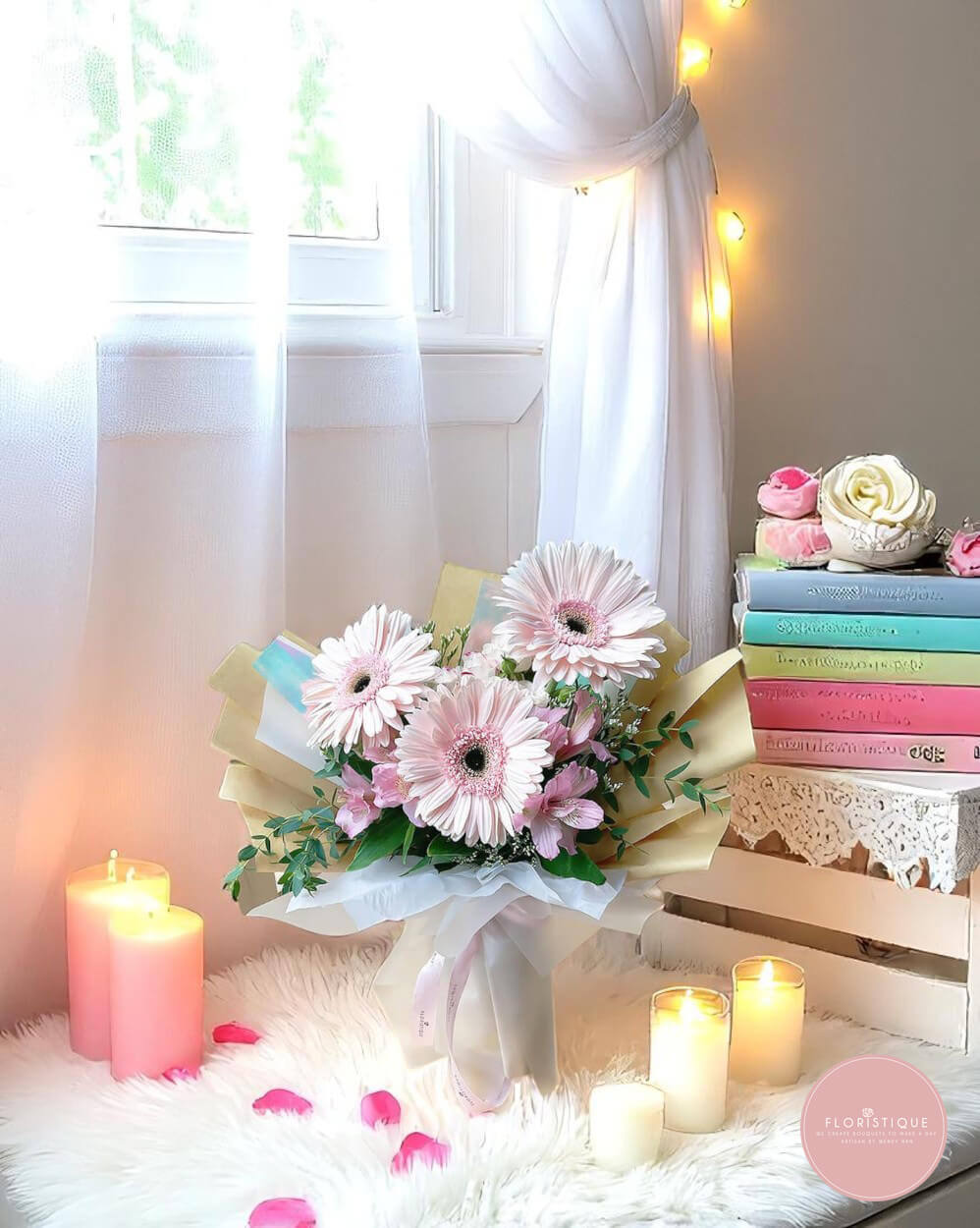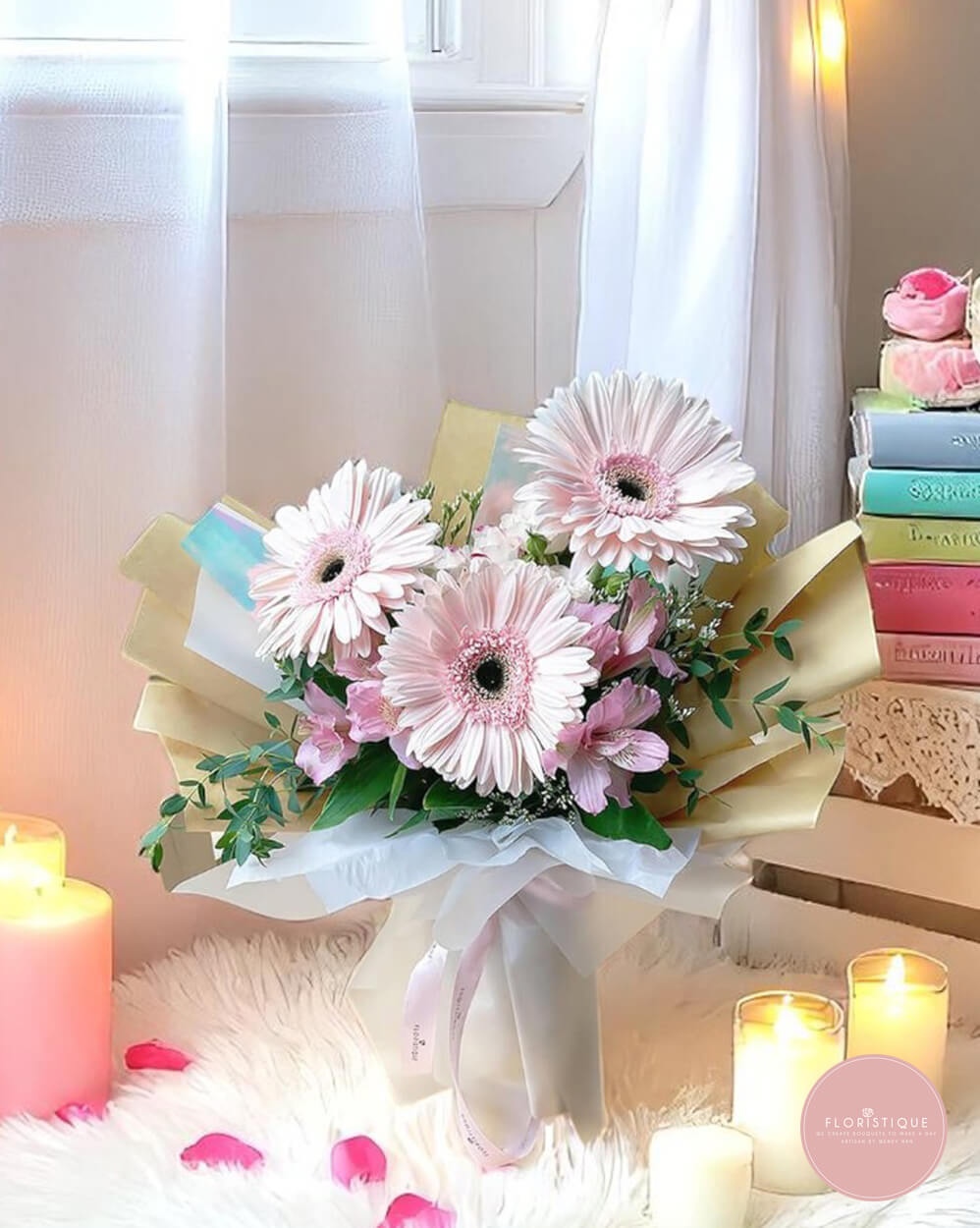 Bright and uplifting, this bouquet features three soft pink gerbera daisies paired with dainty alstroemeria and lush greenery. Wrapped in pearlescent white and warm beige layers with a satin ribbon, it’s a delightful arrangement that radiates joy and elegance.