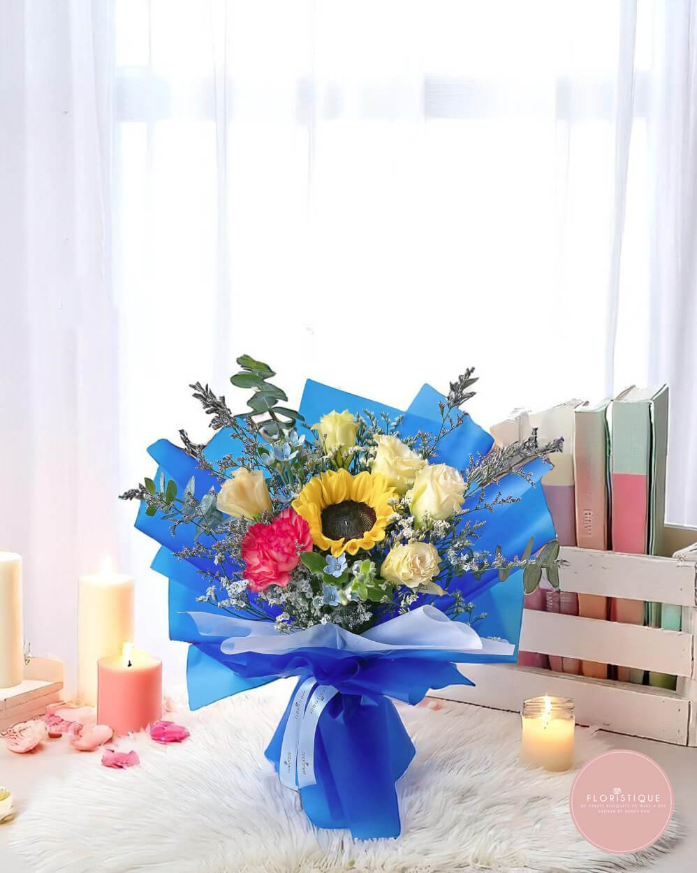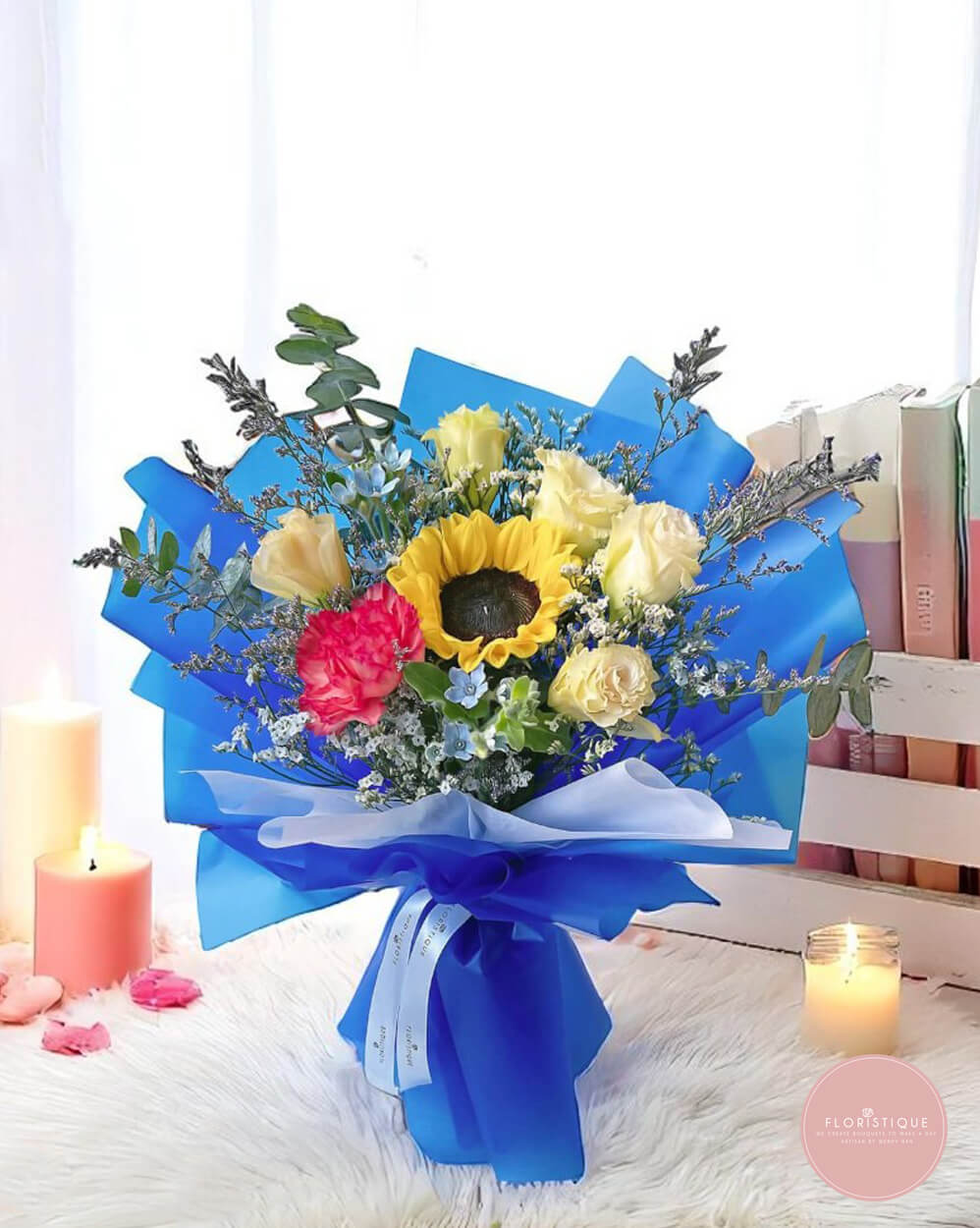 This striking hand bouquet showcases a radiant sunflower framed by elegant champagne roses and a vivid coral carnation, complemented with soft blue seasonal fillers and fresh eucalyptus foliage. Wrapped in layers of bold azure blue paper and finished with a flowing ribbon, the arrangement creates a refreshing contrast of warmth and cool tones—perfect for birthdays, congratulations, anniversaries, or sending a bright message of encouragement and appreciation.